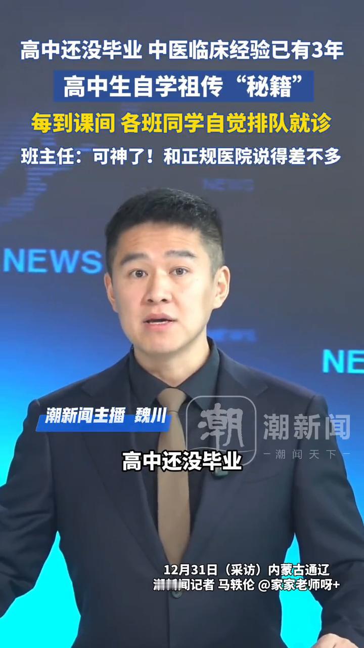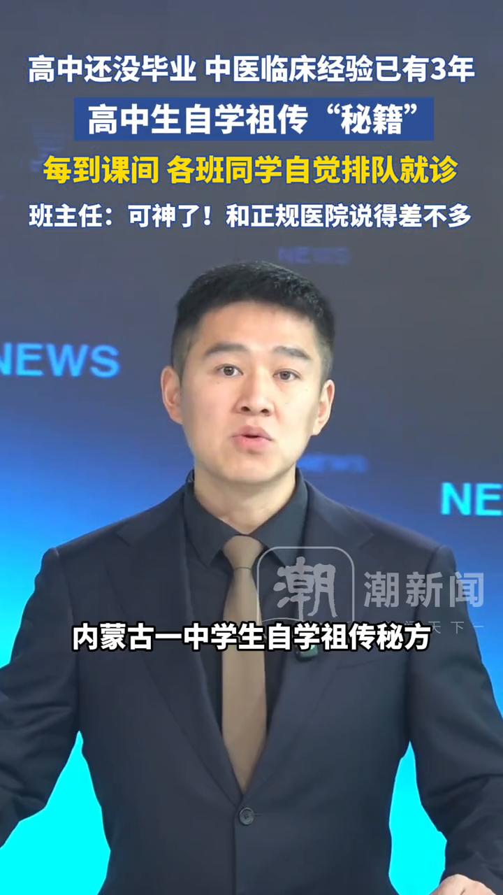 高中生自学祖传"秘籍",每到课间各班同学自觉排队就诊。班主任:可神了!和正规医院说得差不多。 受访人:开鲁县第一中学刘老师。 高中还没毕业,中医临床经验已有3年。祖传的中医蛮神的,说的挺准,和医院里大夫差不多。内蒙古一中学生自学祖传秘方,同学老师都来排队就诊。 12月31日,通辽市开鲁一中刘老师告诉记者,18岁的赵天宇同学祖祖辈辈都是中医,太爷爷留下不少"秘籍"。他从小自学,上高中后利用晚自习后的碎片时间"偷学"。全校很多同学老师都知道,常常在课间来把脉,大家都说很准,和正规医院大夫说的差不多。