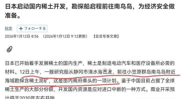 日本态度已明,不会指望中国,日本国内有动作了!1月12日,根据日经新闻报道,就在高市早苗公开表示中国的行为不可接受,管制行为只针对日本之后,日本国内已经有动作了。日媒称,12日上午,一艘日本研究船从静冈市清水港出发,前往小笠原群岛南鸟岛附近海域勘探含稀土泥矿。 中日关系最近闹得挺僵,主要因为高市早苗去年11月在国会上的那番话,她说台湾出点什么事可能威胁到日本的安全,这话一出,北京那边反应强烈,觉得这是干涉内政。结果1月6日,中国商务部就发公告,加强两用物项出口管制,明确禁止向日本军事相关用途出口,包括一些稀土材料。这类东西本来就敏感,稀土在汽车、电子设备和国防上都用得上,日本企业大半稀土从中国进口,一下子供应链就卡壳了。高市早苗在电视节目上回击,说这种只针对一国的措施不符合国际规则,日本外交部也赶紧抗议,要求撤回。 日本这边没闲着,很快就有了回应。1月12日早上,那艘叫“地球号”的深海钻探船从静冈清水港开出去,直奔小笠原群岛的南鸟岛附近海域。这岛离东京有1950公里左右,是个珊瑚环礁,周围海底藏着大把稀土泥。日经新闻报道,这趟任务是全球头一遭尝试从6000米深的海底连续抽取稀土泥浆到船上,计划干一个月,到2月14日结束。船上带了活塞式取样器和泵送系统,目标是每天弄上来350吨泥浆,测试技术行不行。 这不是临时起意,日本从2012年就在南鸟岛海底发现高浓度稀土泥层,估算储量超1600万吨,全球排第三。其中镝够用730年,钇够780年,这些都是电动车电机和激光器里的关键成分。项目由内阁府牵头,日本海洋研究开发机构负责,预算投了400亿日元左右。负责人石井正一说,他们想多元化采购来源,别太靠某个国家,这明显冲着中国去的。中国稀土产量占全球七成,日本进口依赖度从2010年的九成降到现在的六成多,但重稀土还是离不开中国。 高市早苗的态度挺明确,她在NHK节目上说,中国这种经济施压会坏了国际秩序,日本得冷静应对,还拉上七国集团商量怎么建独立供应链。野村综合研究所的经济学家木内登英算了笔账,如果稀土管制拖三个月,日本经济损失6600亿日元,一年就翻四倍到2.6万亿,GDP掉0.43%。这不小啊,日本企业短期内得涨成本,找澳大利亚或越南替代,但开发慢。南鸟岛这项目要是成了,日本能出口稀土,战略地位就上去了,既赚钱又增强议价能力。 不过,日本想自给自足没那么容易。深海作业技术难,成本高,海底高压低温,设备得反复调。2018年他们就开始研发,2025年本想试采但管子交付耽搁了,才推到今年。测试成功后,2027年要在岛上建处理厂,先脱水再运回本土提炼。但建完整供应链得几年,环境评估也得过关。专家上砂考广说,这能保关键产业供应链,但短期解不了燃眉之急。日本还得跟美国合作,加速开发海外矿。 这事接地气点说,日本就是不想把鸡蛋全放一个篮子。中国稀土优势是多年积累,日本得花时间追。G7最近在华盛顿开会,聊怎么摆脱依赖,强调公平竞争,但得承受涨价。片山皋月批评中国用非市场手段垄断,但日本也得反思自家政策。稀土危机不是头回,2010年钓鱼岛事件时就闹过,日本那时就开始减依赖,现在又来一轮。 长远看,日本这步棋下得有道理。南鸟岛位置敏感,是第二岛链起点,开采还能监视周边活动。稀土国产化是经济安全的一部分,高市政府推这事,也想在选前稳支持率。她决定1月23日解散众议院,提前大选,民调高位,但预算案可能延后,民生受影响。在野党批评她把党派利益放前头。 总之,日本态度摆明了,不会指望中国松手,得靠自己。南鸟岛勘探是第一步,成败关乎未来供应链。但问题多,时间长,日本得咬牙坚持。国际上,这推动各国多元化,稀土市场格局可能变。中国发言人何亚东说,管制是为防日本再军事化,民用不受影响。但销售企业已停签新合同,日本企业慌了。野村报告说,损失大,但日本有预案,不会轻易退让。 这局面挺有意思,中日博弈不光经济,还牵扯地缘。日本响应快,船都出去了,显示决心。但真独立自主,得看技术赶不赶得上。中国优势稳,短期日本得付代价。专家说,这是持久战,各国合作是关键。南鸟岛稀土泥不含放射物,处理成本低,重稀土多,正对日本缺口。但产量稳定性和环境影响,得边干边看。日本与盟友联手,建韧性供应链,避开单源风险。 话说回来,日本企业评估损失,汽车电器机械最受打击。全球稀土需求涨,电动车半导体推高。日本回收稀土和低用量技术已推进,但深海开采是新路。JAMSTEC声明,这是国产化第一步。法新社报道,全球首例深海试采,战略意义大。高市想用这减依赖,成战略资产。 日本这动作快,管制刚出不到一周就动身。体现预案足,不会因施压就撤。时间是关键,日本精炼速度慢,代价不小。中国建链花多年,日本也得耐心。总之,这事告诉大家,关键矿产安全重要,别太靠别人。