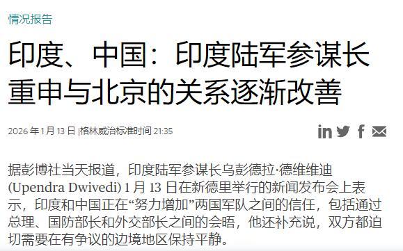 印度主动示好中国 当地时间1月13日,印度军方高层在接受采访时明确表示:正在努力增强两国互信,包括总理、国防和外交部长在内的最高领导层在近几个月已经举行了会晤。 要知道军事层面的态度转变,往往是两国关系走向缓和的重要信号,而印度此次的主动示好,绝非一时兴起,而是基于自身发展需求和地区局势判断的战略选择,背后更是政治、经济、人文等多领域的协同发力。 从政治层面来看,高层互动的密集程度早已为关系缓和埋下伏笔。2025年作为中印建交75周年,两国元首就互致贺电,强调要从战略高度看待双边关系,增进互信、加强合作,这为全年的关系改善定下了基调。 同年8月,印度总理莫迪时隔七年再访华,在天津与咱们习主席会晤时明确表示“印中是伙伴而不是对手,共识远大于分歧”,这番表态打破了此前外界对中印关系的悲观预期。 而且中印边界问题特别代表第24次会晤还达成了10点共识,不仅同意在边境东段和中段新增将军级会谈机制,还设立了划界专家小组推进谈判,这些机制化的安排让边境管控有了更可靠的保障,也为两国关系稳定消除了最大隐患。 经济利益的绑定则是印度主动示好的核心驱动力之一。在全球经济增速放缓的大背景下,中印这两个超10亿人口的大市场,合作潜力早已显现。 根据印度商工部2026年1月发布的数据,2025年1-11月中印双边贸易总额达到1253.49亿美元,同比增长15.2%,其中印度对华出口增长32.7%,增速远超其对其他主要贸易伙伴的表现。 而且在新能源这个朝阳产业,两国合作已经进入快车道。截至2025年10月,比亚迪、名爵等中国关联品牌在印度乘用电动车市场占据了三分之一的份额,隆基绿能还与印度企业达成了5吉瓦光伏技术本地化合作协议,中汽新能更是拿到了印度电网的大额储能订单。 这些合作不仅帮印度补齐了新能源产业链的短板,也为中国企业开辟了广阔市场。与此同时,双方还同意重开仁青岗-昌古等三处传统边境贸易市场,恢复自2020年中断的边境贸易,这些举措都在让经贸合作成为中印关系的“压舱石”。 民间交流的回暖则让中印关系的缓和更有温度,也为官方合作奠定了坚实的民意基础。2025年7月,印度时隔5年首次恢复向中国公民签发旅游签证,随后又简化手续加快发放商务签证,而中国也同步恢复了印度香客赴冈仁波齐峰和玛旁雍错湖的朝圣活动,首批朝圣者经由乃堆拉山口顺利前往,延续了两国千年的文明对话传统。 同年10月,中印客运直航航线正式恢复,首个航班从加尔各答起飞降落广州,3个多小时的航程让两国民众往来更加便捷。 人文交流的活力还体现在文化领域,印度古典音乐代表团在北京、上海举办巡演,中国书画展也走进了新德里,这些活动让两国人民重新拾起对彼此文明的好奇与尊重,而这种民间的理解与认同,正是国家间关系长期稳定发展的关键。 可能有人会问,印度此时示好是不是权宜之计?其实从种种迹象来看,这种缓和是全面且可持续的。 军事上,中印两军在2025年10月举行了边境西段第23轮将军级会谈,明确继续通过军事和外交渠道沟通管控问题。 外交上,副外长级对话、边境事务磋商和协调工作机制会议等多个机制性会谈持续举行,形成了常态化沟通模式。 多边层面,两国在上海合作组织、金砖国家等框架内密切协作,共同维护发展中国家权益。这些都说明,中印双方都已经认识到,“合则两利,斗则俱伤”,与其在对抗中消耗资源,不如在合作中实现共赢。 当然,我们也要清醒地看到,中印关系的改善不可能一蹴而就,边界问题等历史遗留分歧仍需要耐心协商解决。 但正如中国驻印度大使徐飞洪所言,中印关系如同长江和恒河,虽历经风雨但始终奔涌向前。此次印度军方的主动表态,加上此前多领域的破冰举措,已经让中印关系站在了新的起点。 未来,随着2026年中印边界问题特别代表第25次会晤在中国举行,以及更多合作项目的落地,两国完全有机会走出一条相邻大国和睦相处、共同发展的道路,不仅惠及两国28亿人民,也将为亚洲乃至世界的和平与繁荣注入正能量。 MCN双量进阶计划
