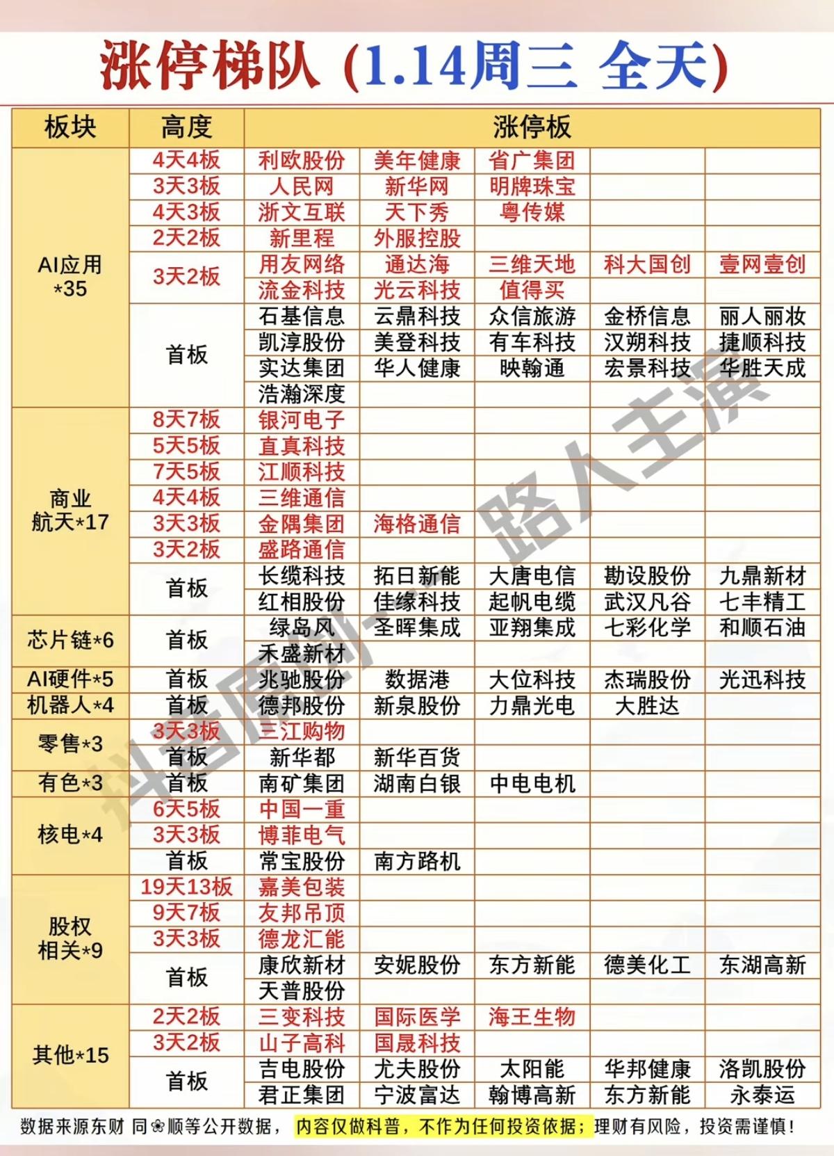 1.14周三 涨停板股票:题材分布! 智能AI应用 35股涨停 商业航天 17股涨停 芯片链 6股涨停 硬件AI 5股涨停 机器人 4股涨停