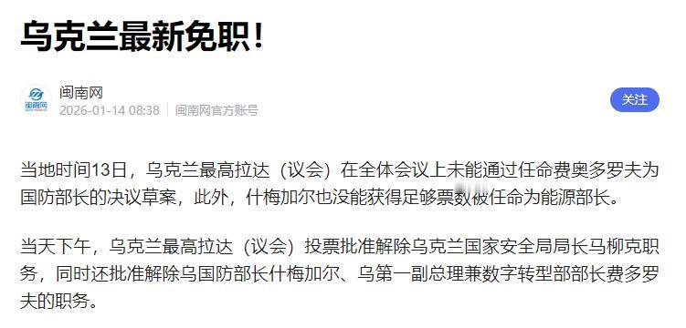 戏剧性的反转!泽连斯基两项核心任命全被否! 前一天还被泽连斯基夸下海口、看似板上钉钉的国防部长与能源部长人事调整,转天就遭遇“滑铁卢”;议会先爽快通过免职程序,转头就把新任命提案全数否决,这种前后矛盾的操作,让泽连斯基颜面尽失。 1月2日,泽连斯基就高调宣布了自己的人事布局,明确要让精通数字技术的第一副总理费奥多罗夫接替什梅加尔出任国防部长,而卸任国防部长的什梅加尔,则转岗去竞争能源部长一职。 当时泽连斯基言之凿凿,强调这一调整是为了优化国防运作模式、强化能源领域治理,大有一副胸有成竹的架势。 到了1月13日,事情似乎按泽连斯基的剧本推进,乌克兰最高拉达(议会)顺利通过了免去什梅加尔国防部长职务、解除费奥多罗夫数字化转型部部长职务的决议,相当于为新任命扫清了前置障碍。 可谁能料到,紧接而来的任命投票环节,剧情直接反转。泽连斯基提交的任命费奥多罗夫为国防部长的决议草案,没能拿到足够票数;什梅加尔竞争能源部长的提议,同样惨遭否决。 一番紧锣密鼓的操作下来,不仅新官没上任,连原来的岗位也空了出来,国防和能源这两个战时核心部门,瞬间陷入“群龙无首”的真空状态,这波操作堪称弄巧成拙、得不偿失。 这两位被提名者都不是无名之辈,尤其是费奥多罗夫,堪称泽连斯基的“铁杆心腹”。 自2019年泽连斯基上台,费奥多罗夫就一直身居要职,主导开发的Diia数字化应用程序被视为政绩亮点,冲突期间还深度参与无人机生产项目,被泽连斯基寄予厚望,认为他能给国防部带来技术革新。 什梅加尔更是政坛老将,此前担任国防部长不足半年,还曾担任总理五年多,按说有一定的行政经验。可即便如此,议会还是不给泽连斯基半点情面,两项提名全数驳回。 背后的原因其实很直白,就是乌克兰政坛对泽连斯基的信任已经消耗殆尽。 近年来泽连斯基频繁进行人事调整,尤其是近期,不仅动了国防、能源这样的核心部门,还改组了最高统帅部,将心腹布达诺夫提拔为总统办公室主任,试图强化自己的执政掌控力,这种近乎“一言堂”的操作,早已引发议会诸多派系的不满。 费奥多罗夫来虽然在数字技术和无人机领域有成绩,但缺乏直接的军事指挥和战场协调经验,在俄乌冲突持续的敏感时期,让这样一位“技术官僚”掌舵国防部,不少议员担心他难以应对复杂的战场局势,这背后其实是对泽连斯基决策合理性的质疑。 更值得注意的是,就在这波人事闹剧上演的当天,乌克兰国家反腐败局还发布公告,称议会某党团领导人涉嫌收买议员选票,虽然没明确点名,但也让本就紧张的政坛氛围雪上加霜。 在这样的背景下,议会否决泽连斯基的提名,更像是一种无声的抗议,既是对其人事安排的不认可,也是对其执政风格的反击。 毕竟在战时状态下,国防关乎前线战士的生死,能源维系着民众的基本生活,这样的核心岗位,议员们自然不敢轻易放权给泽连斯基指定的人选。 接下来泽连斯基该如何收场,是重新提名候选人寻求妥协,还是硬刚议会继续推进改革,目前还不得而知。但可以肯定的是,经此一役,他在乌克兰政坛的信任度只会更低。