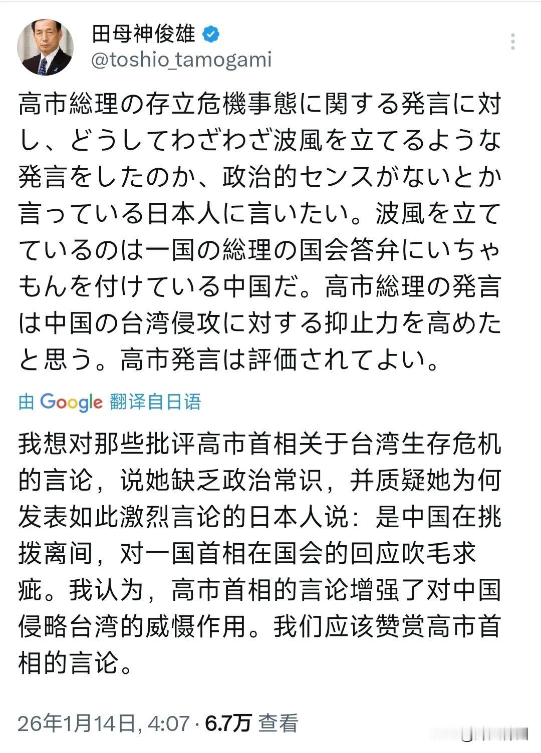 日本极右翼政客、前日本航空自卫队幕僚长田母神俊雄今天(1月14日)写道:“我想对那些批评高市首相关于台湾生存危机的言论,说她缺乏政治常识,并质疑她为何发表如此激烈言论的日本人说:是中国在挑拨离间,对一国首相在国会的回应吹毛求疵。我认为,高市首相的言论增强了对中国侵略台湾的威慑作用。我们应该赞赏高市首相的言论。” 评几句: 日本前航空自卫队幕僚长田母神俊雄近日就高市早苗涉台言论发声,不仅为其相关表态站台,还声称中国“挑拨离间”,甚至将此类言论称作“威慑中国侵略台湾”的举措,这番说辞与公认的历史法理和客观事实不符。 台湾是中国领土不可分割的一部分,这是国际社会公认的事实,更是《开罗宣言》《波茨坦公告》等一系列国际法文件明确规定的内容,也是1972年《中日联合声明》确立的共识。据公开报道,高市早苗曾将台湾问题与所谓“日本生存危机”相关联,此类言论本质上是对中国内政的介入;田母神俊雄为之发声的行为,无疑会对地区局势的稳定造成负面影响。 世界上只有一个中国,台湾问题纯属中国内政,任何外部势力都无权干涉。相关日本政客的类似言论,既违背历史潮流,也无视中日两国的共同利益。中国捍卫国家主权和领土完整的决心坚定不移,任何妄图插手台湾问题的举动,都不符合地区国家的共同期待。