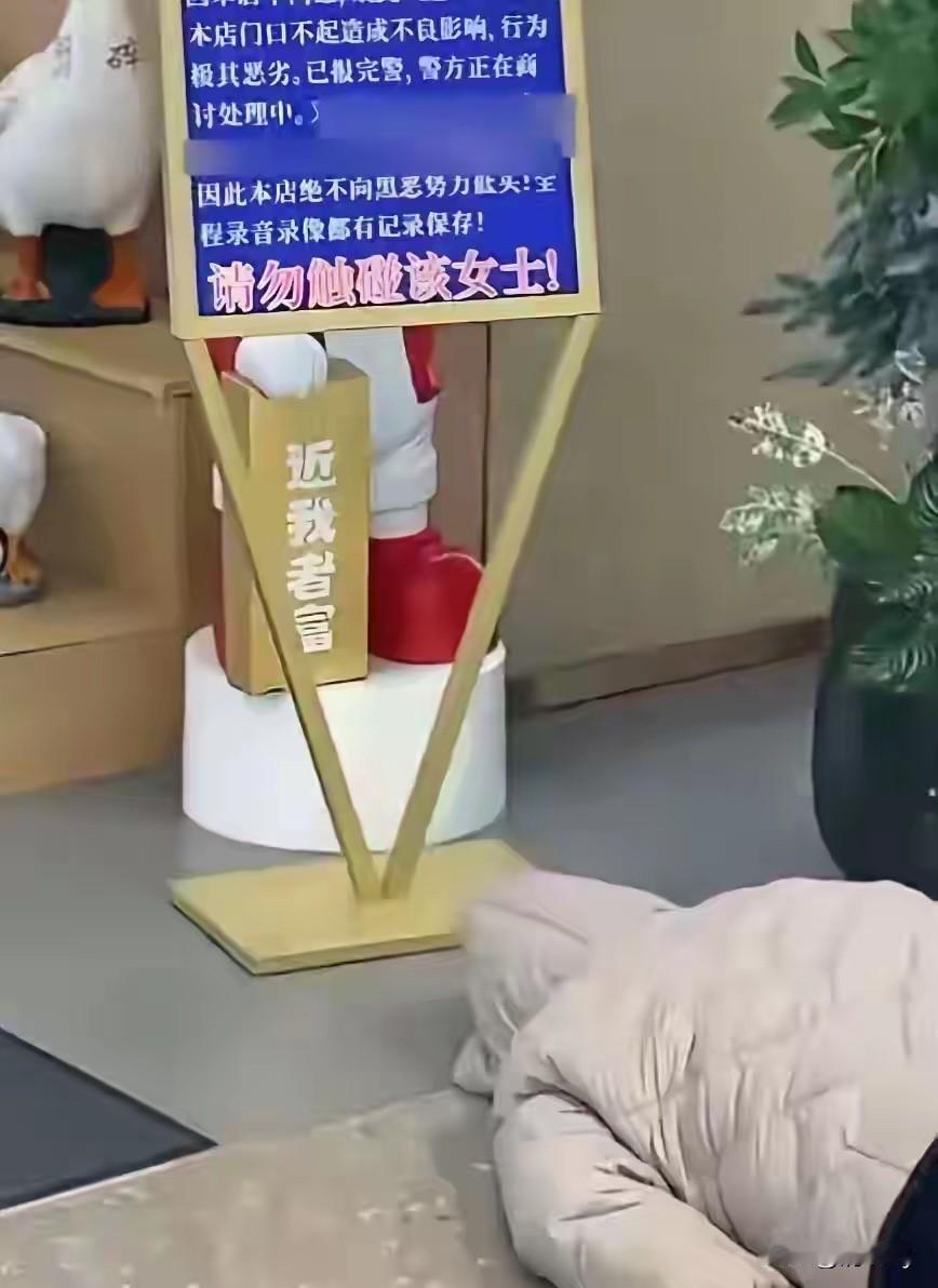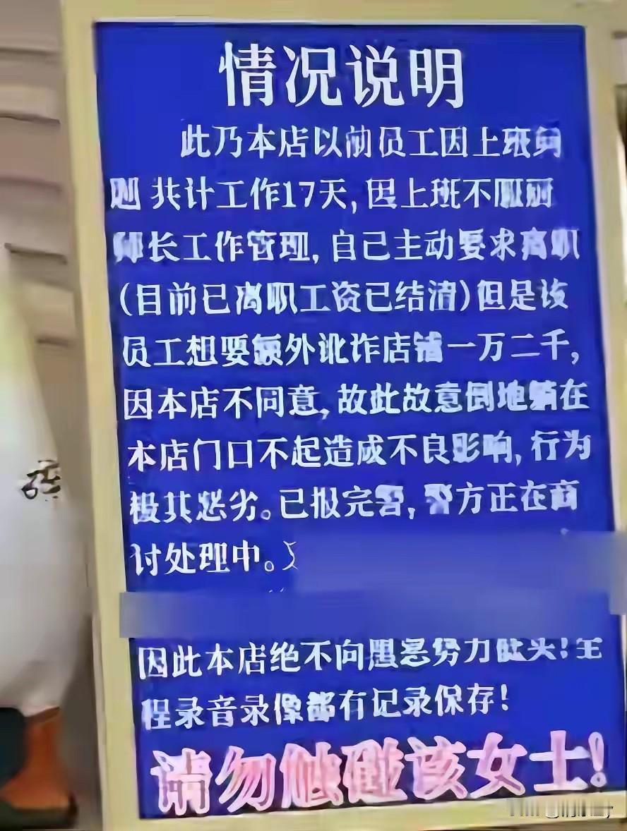 真是奇葩!河南商丘一餐馆门前,一女子趴在地上用帽子盖住头,已经趴四五天啦! 店家立了一块牌子说明情况,原来女子是店里的员工,在店里工作了17天,因为不服从管理,就主动辞职不干了! 店里已经把工资给女子结清,但不知什么原因,女子索要赔偿金1万2千元,双方未能谈拢,于是该女子就做出了此举,谁劝都不听! 没办法的情况下,店家只能立了块牌子说明情况,结尾更是用大体字写着:“请勿触碰该女士”,店家已经报了警,目前对女子的行为,也没特别好的办法! 大冬天的躺地上多凉啊,有纠纷可以走正规渠道,可以到法院去起诉,让法官来断! 当前多部门都与该女子沟通,她就是不说话也不起身,估计趴够了也就起来了!毕竟地上太凉了!