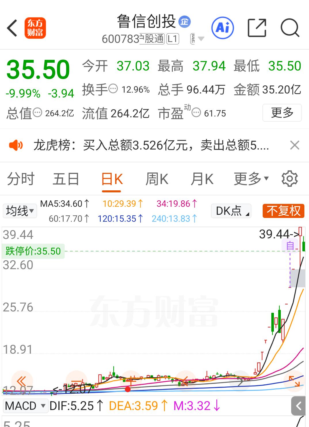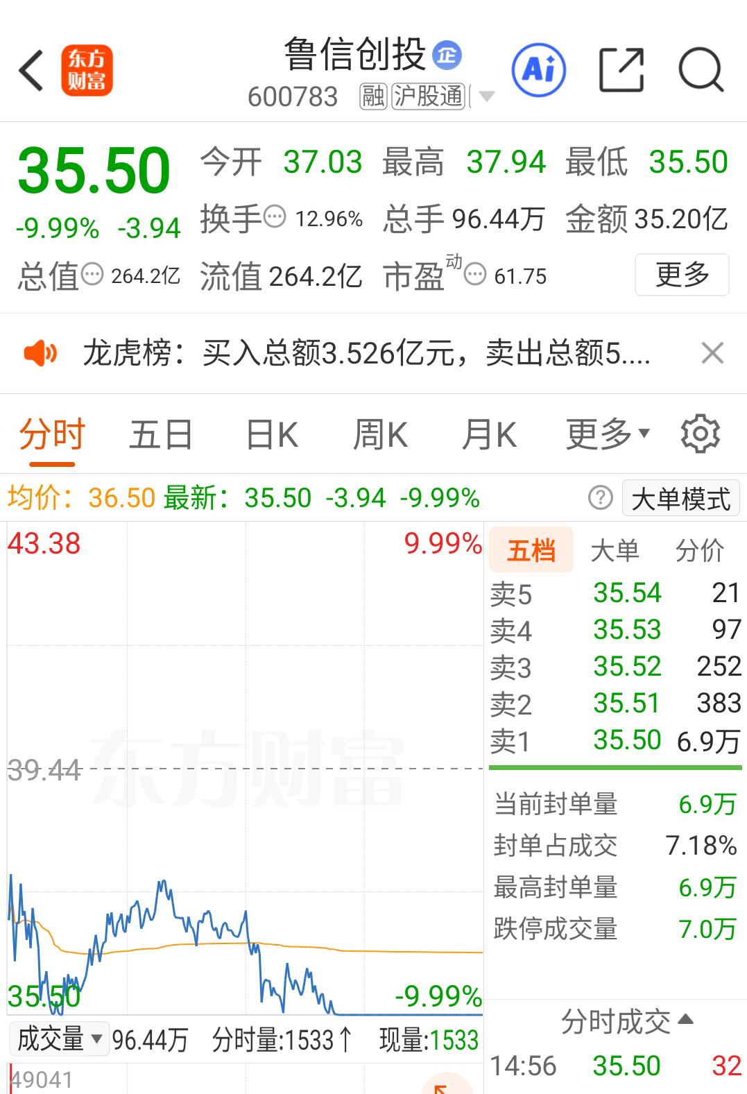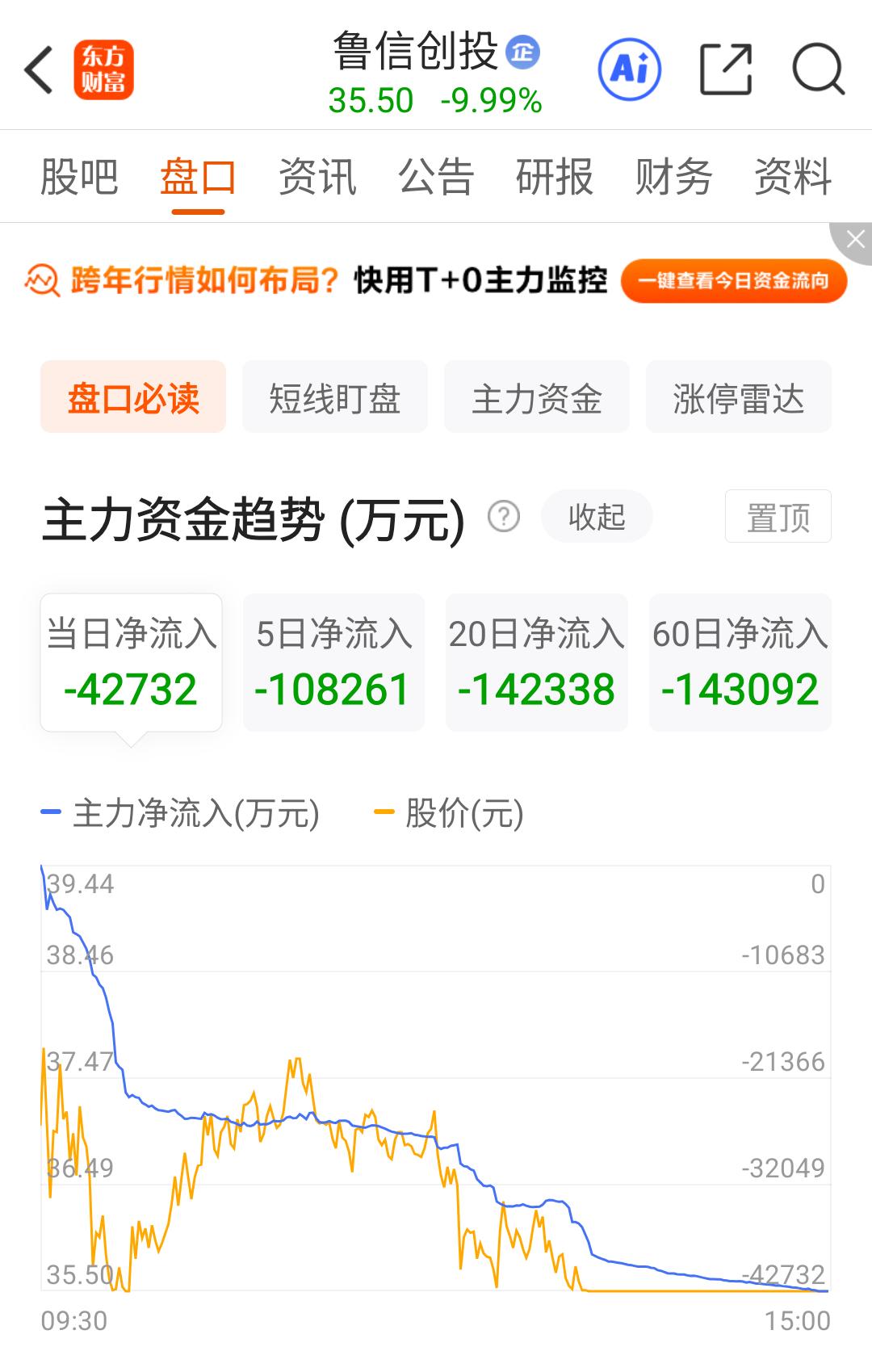 鲁信创投昨天勇猛反核,走出准地天,今天低开跌停,能得到什么经验?(持续跟踪学习二) 昨天鲁信创投成为商业航天板块主动反核扛大旗的勇者之一,从早上大跌8个多点,到下午上板继续创新高,成功实现了二波6连板。 但是昨天看盘后的数据,让人百思不得其解:昨天主力超大单和大单合计净流出8.1亿,龙虎榜买榜净买入3.52亿,净卖出5.31亿,合计净流出1.79亿。而且成交量是近期的天量,54.97亿。 心中疑惑一:在这样的卖盘力量下,股价是如何从水下8个多点拉到涨停板的? 难道是拉萨天团的合力所致? 昨天已经有三个拉萨天团在买入榜上了。反正以前我遇到的,第二天都被搞的非常惨,不知道明天会怎么走? 疑惑二:陈小群昨天到底走没走呢? 再来看今天的表现:首先是大幅低开,挣扎了一会之后,9点53分跌停,随后虽然被撬板,但是拉到负4.5%左右无功而返,下午1点47分之后封死跌停板。 盘后数据:全天成交量35.2亿,比昨天的54.97亿缩量35.96%。而超大单和大单以及中单合计净流出4.27亿,小单净流入4.32亿。 今天没有龙虎榜,不知道陈小群有没有出货,也不知道昨天唯一进去的游子跑了没有。 个人猜测:昨天新进的游子今天已经抢跑了,剩下的仍然是拉萨天团在里面做T,已经很难再形成合力了。 个人预判:明天至少还会再惯性下探5%左右,如果航天板块整体还不能回暖,再来一个跌停都有可能。因为整个板块内连续两个跌停的已经超过6家,其中就包括总龙 航天发展。 继续跟踪,持续学习,明天盘后再看会不会有龙虎榜,再看陈小群有没有跑掉。 暂时和以往的经历得出的经验:连续大涨之后,在板块集体退朝,尤其是大面积跌停的情况下,千万不要去参与撬板,大部分撬不开,极个别撬开了,都会无功而返,即使是运气好走出地天板,第二天跌停的概率还是非常高的。所以,不能冒这样的险,还是去跟新主线才是最正确的,就比如像上周五晚上说的AI应用。有新方向,绝不能再大面积退朝期在老方向上纠缠。