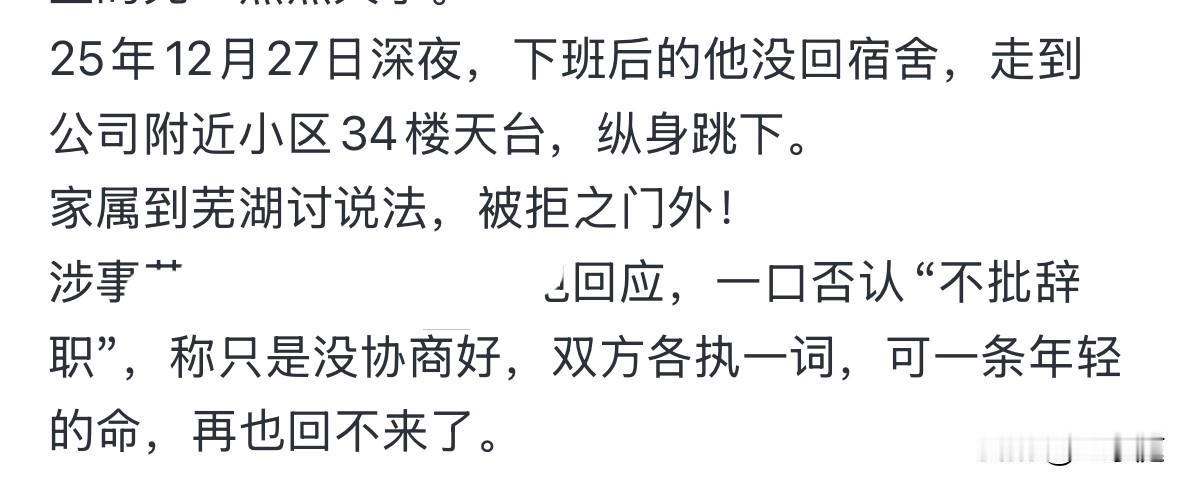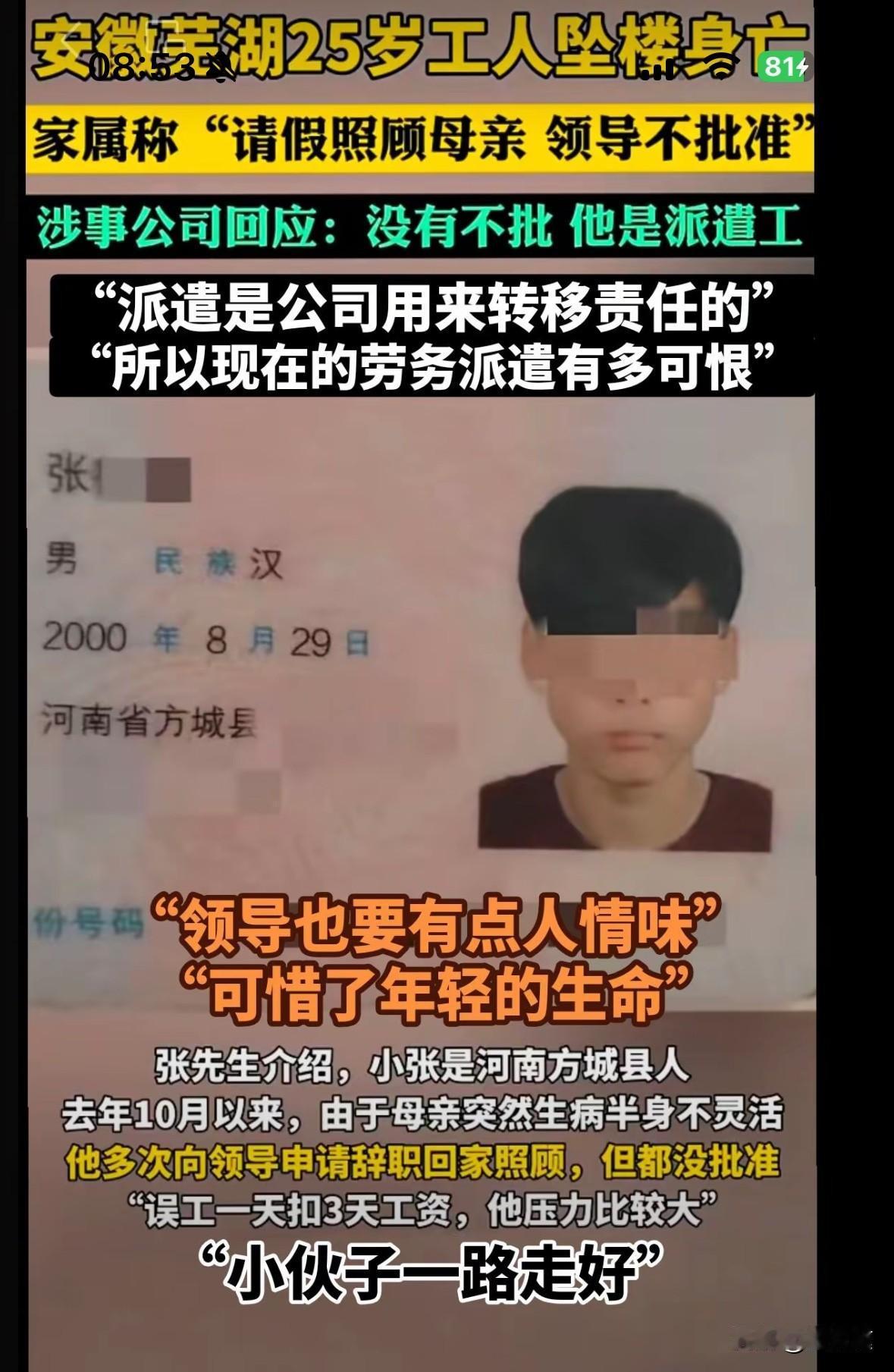 25岁河南小伙跳楼身亡背后,有一件事令人意想不到:他的一位工友居然在事后果断挺身而出,说出了公道话。 小张,于2000年出生于河南方城。走入社会后,他通过一家劳务派遣公司,进入安徽芜湖的一家公司工作。 他为人真诚,很老实,平日的时间里,每天都是两点一线的工作,以此赚取微薄的薪水。 2025年10月,他的母亲突发疾病。虽然有幸捡回一条命,但却落下了半身不遂的后遗症。 小张姐姐早已经出嫁,这就意味着她也有自己的小家庭要照顾。作为家庭顶梁柱的小张,不忍心把赡养母亲的责任丢给姐姐一个,于是,便想辞职回去照顾母亲。 哪里知道,就这样一个小小的心愿最终也落空了! 辞职没有被批准,他就无法离开。而一旦旷工一天,就意味着他要少几天的工资。对于其他人来说,或许可以大大方方的自离。但自离,就意味着工资要打水漂了。对于小张来说,这是真的难以承受之重。 一方面:他的母亲不久前才刚被抢救回来,想必是花掉了不少钱的。 另一方面:他回去照顾母亲时,不能在工作了,急需一笔钱维持正常的生活开支! 关键时刻,一分钱难倒英雄好汉啊! 2025年12月27日,小张的情绪崩溃到了极点,当晚,他从34楼一跃而下结束了自己年仅25岁的生命! 悲剧发生后,其姐姐姐夫想要给弟弟讨个说法。但负责人却回应说,没有不批辞职书。 在这个事情背后,小张的一个同事的做法令人感动。 他不怕给自己带来麻烦,哪怕会丢掉自己的工作,也果断选择实名写下证言。 他证实,早在一个月前,小张就曾和他说过,他先后五次找主管辞职,都没有获批。 悲剧已然发生,是不可挽回的!但小张的这个同事却让人看到了悲剧中唯一暖心的一幕!都说人走茶凉啊,但这位同事却在关键时候挺身而出。如此,也恰恰说明了小张可能是个很好的小伙子,才能收获这样一份友谊。 小张,终究还是太老实了,他甚至都不知道去相关部门求助,去运用法律的武器替自己争取权益,就默默的选择了离开人世! 成年人的生活,虽然不易,但他忽略了,只要留得青山在 就不怕没柴烧。没有任何事情,会比自己的生命还重要!他母亲本身就离不开人照顾了,眼下,该如何是好啊?[祈祷]