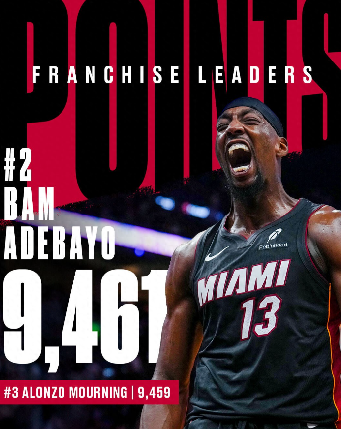 在迈阿密热火以127比121战胜菲尼克斯太阳的比赛中,热火球星巴姆·阿德巴约出战32分钟,15投11中三分线外6中4,罚球4罚3中,贡献29分9篮板4助攻。 此役过后,阿德巴约的生涯总得分超过了莫宁的9459分,升至热火队史得分榜第二位。仅次于热火名宿德维恩·韦德,后者在热火效力期间一共砍下21556分。