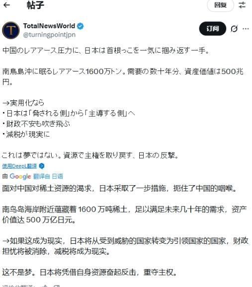 高市亲自指挥试采稀土,日本网友提前开香槟:中国要哭了   日本首相高市早苗踩着中国出口管制的时间点,亲自督战的南鸟岛稀土试采,本质上是一场被危机感逼出来的冒险。当东京的商社因为买不到中国稀土急得团团转时,6000米深的太平洋底突然成了救命稻草。   中国2025年10月升级的稀土管制,像一把精准的手术刀。新规不仅卡死直接出口,更把"含有中国稀土成分的境外产品"纳入监管,连稀土冶炼技术、生产线维护都要审批。这意味着日本就算从第三国买稀土,只要用了中国技术或原料,照样得看中方脸色。   最狠的是军事用途禁令,任何沾边军工的稀土申请,直接驳回。数据显示,日本70%的稀土依赖中国,高端制造业如半导体、新能源汽车,甚至自卫队的导弹制导系统,都离不开中国的镝、铽等重稀土。管制一出,日本企业的生产线瞬间嗅到停产的味道。   高市政府的反应像被烫到的猫。这边厢在外交场合硬撑"绝不容许单方面管制",那边厢紧急启动搁置多年的南鸟岛计划。   1月11日,"地球号"科考船带着120亿日元的管道设备,一头扎进6000米深海——这个深度相当于把六座上海中心大厦叠起来,水压能轻易压扁普通潜艇。   所谓的"试采",不过是用采矿机吸海底泥浆,每天目标350吨,却只能提炼出70公斤稀土——这点量,不够日本一家中型电机厂塞牙缝。   更讽刺的是,日本2022年才在2500米浅海勉强验证技术,如今直接跳级三倍深度,连美国专家都摇头:"这不是技术突破,是赌徒下注。"   这场豪赌的账本,每一页都写着亏本。南鸟岛稀土埋在松软的海底泥层里,提取需要大量化学溶剂,成本是陆矿的数十倍。   就算不计成本挖到1600万吨储量,精炼环节又卡住脖子——全球92%的稀土提纯能力在中国,日本连一条完整的分离产线都没有。   更别说环保账:深海采矿会搅动沉积层,释放重金属和放射性物质,国际海底管理局连开采规则都没定,日本却急着在自家专属经济区"先斩后奏",结果瑞士信贷等银行直接拒绝融资,理由是"环境评估没过"。   日本网友的乐观,建立在对产业链的无知上。他们嘲笑"中国要哭",却不知道稀土从泥巴变成磁材,需要20多道工序。中国不仅掌控开采,更垄断了磁材制造技术——比如钕铁硼磁体的烧结工艺,日本企业曾试图高薪挖中国工程师,结果被新出台的技术管制条例直接堵死。现在日本就算挖到稀土泥,还得运回本土建精炼厂,光设备投资就得几百亿美元,工期至少五年——而他们的生产线,等不了五个月。   高市政府不是不知道这些账,只是被政治赌局逼上绝路。自上台以来,她频打"台湾牌"挑衅,甚至放话"必要时协防",结果换来中国针对性管制。   2010年钓鱼岛争端时,中国收紧稀土配额,日本车企三个月损失40亿美元的教训还没淡去,如今历史重演,只不过这次中国的管制更精准——直接掐住军工和高端制造的七寸。南鸟岛计划与其说是经济自救,不如说是政治遮羞布:向国内展示"强硬对抗",给美国主子交投名状。   但这场戏的破绽百出。日本自卫队高官私下承认,就算试采成功,最早2028年才能小规模量产,而中国的稀土管制已经留出"合规口子"——只要不涉及军事用途,许可申请仍可通过。   换句话说,日本越搞对抗,越拿不到稀土;越想"去中国化",越陷进成本泥潭。更尴尬的是,美国嘴上支持"供应链多元化",自家稀土精炼产能不到全球5%,连F-35战机的稀土部件都依赖中国。日本拉拢的中亚国家,勘探项目扯皮多年,远水解不了近渴。   最讽刺的是日本网友狂欢的"摆脱中国",恰恰暴露了对中国产业链的深度依赖。他们喊着"禁止中国看动漫"的孩子气威胁,却不知道中国早已建成全球最完整的稀土产业链——从勘探到磁材,400多个品种全覆盖。日本要复制这条链,不仅要砸万亿日元,还得解决技术工人断层、环保审批卡死等难题。   高市早苗的深海冒险,本质是用战术勤奋掩盖战略误判。她低估了中国维护主权的决心,更误判了全球产业链的互补性。当日本企业在管制下焦头烂额,当"地球号"在深海里捞着赔本的泥浆,对岸的中国稀土产业链正加速升级——从初级原料到高端磁材,从技术管制到合规出口,每一步都走得扎实。   这场稀土博弈的结局,早在中国织密产业链网的那天就已注定:靠政治挑衅抢不来资源,唯有尊重市场规律,才能真正保障供应链安全。而日本网友的"香槟",终将变成苦涩的醒酒汤。