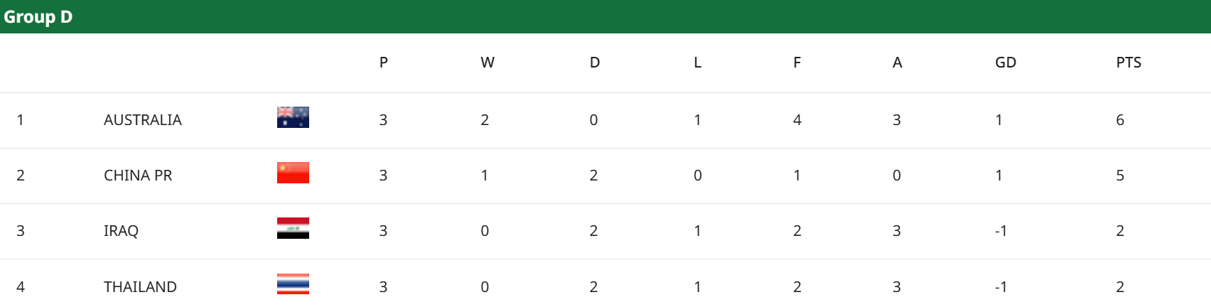 虎扑01月14日讯U23亚洲杯小组赛D组比赛结束,本组积分榜情况如下。