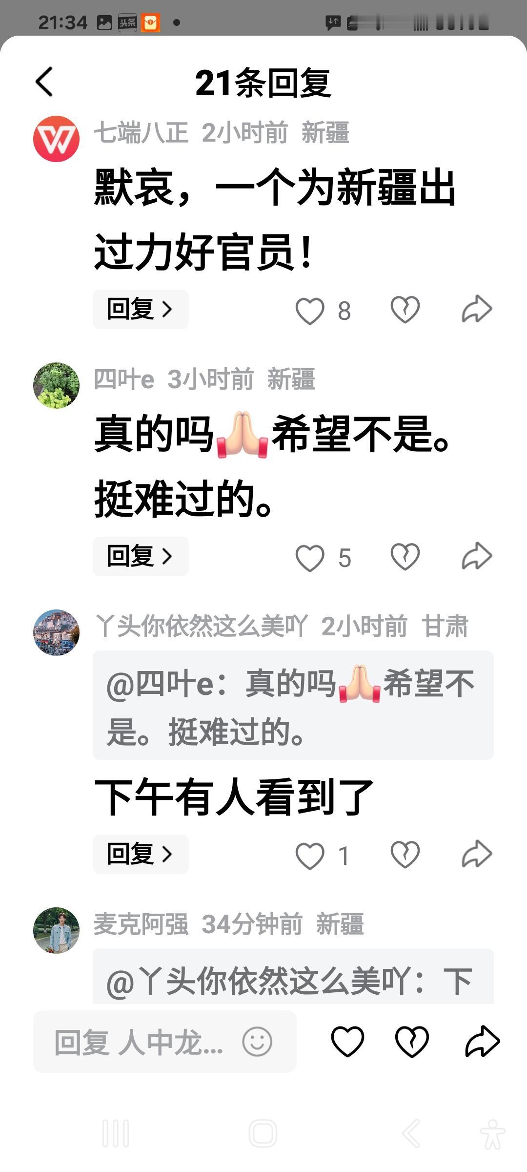 网上消息非常混乱,虽然澎湃新闻上午已经撤回了消息,中午中国新闻说正在抢救,但是下午和晚上评论区IP来自新疆网友的声音却是这样的,弄得人真假难辨,十分揪心。 不过希望中国新闻说的是真的,正在抢救,阿弥陀佛![祈祷][祈祷][祈祷]