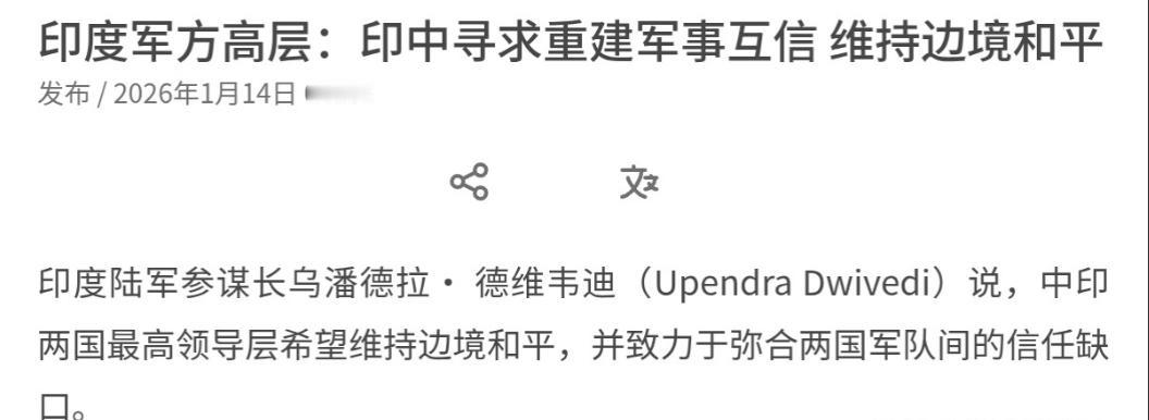 印度主动对我们示好!1月14日,根据外媒报道,印度陆军参谋长乌潘德拉· 德维韦迪表示,中印两国最高领导层希望维持边境和平,并致力于弥合两国军队间的信任缺口。我们正在努力增强两国军队间的互信。包括最高层级、国防和外交部长在内的领导层近几个月已举行会晤。 印度此次抛出橄榄枝,背后是国际国内诸多因素交织的复杂棋局。 在国际舞台上,当今世界格局正经历深刻变革,地缘政治竞争愈发激烈,中美博弈的大背景下,印度作为南亚举足轻重的大国,成为各方拉拢的对象。 美国一心拉拢印度,试图将其纳入遏制中国的阵营,然而,印度并非任人摆布的棋子,它深知完全倒向美国会失去战略自主性。 与中国维持边境和平,能让印度在大国间保持平衡,在国际事务中拥有更多话语权,避免被卷入不必要的冲突漩涡。 国内层面,印度面临着诸多棘手的发展难题,经济上,尽管近年来取得一定进步,但基础设施落后、贫富差距悬殊等问题依旧突出。 稳定的边境环境是吸引外资、促进贸易和投资的关键前提,能为经济发展创造良好条件。 社会方面,宗教冲突、种姓制度等矛盾长期存在,边境局势紧张会分散政府精力,加剧社会不稳定因素。 因此,缓和与中国的关系,有助于印度集中资源解决国内问题,实现长治久安。 印度此次示好,为中印边境和平带来了新的机遇,双方领导层的积极表态和高层的频繁会晤,为增进军队互信搭建了坚实桥梁。 通过加强军事交流与合作,建立高效沟通机制,能够及时化解边境地区的误解与摩擦,防止局势失控升级,而且,边境和平有利于推动两国在经贸、文化等领域的深度合作。 中印贸易蕴藏着巨大潜力,和平稳定的边境环境恰似贸易往来的通途,能极大提供便利,有力促进两国经济携手繁荣,进而达成互利共赢之良好局面。 但我们也要清醒地认识到,和平之路并非一帆风顺,挑战如影随形,印度在边境问题上的态度曾反复无常,过去的边境冲突给两国关系蒙上了阴影。 此次示好是否真诚且能持续,仍有待时间检验,此外,印度国内一些势力可能会对政府的示好举措心存疑虑甚至反对,给和平进程设置障碍。 印度主动示好,对中印两国而言都是积极信号,对印度来说,与中国和平共处是实现自身发展目标的理性抉择,在全球化浪潮下,各国命运紧密相连,合作才是时代主流。 印度当摒弃零和博弈之陈腐思维,秉持开放包容之态,与中国开展全方位协作,携手共进,共拓发展新境,方能实现互利共赢,共创美好未来。 于中国而言,我们一贯秉持和平共处五项原则,诚心冀望与印度携手维护边境的和平稳定,然而,我们亦需保持高度警觉,做好应对诸般复杂状况的充分准备。 在积极推进和平进程之际,需持续强化国防建设,着力提升应对边境突发状况之能力,以坚不可摧之姿态,捍卫国家主权与领土完整,筑牢国家安全之坚实壁垒。 中印两国皆具源远流长之历史、绚烂夺目的文化,作为文明古国中的熠熠明珠,它们在人类历史长河中闪耀着独特而迷人的光彩。 双方当以史为鉴,珍视这来之不易的和平之局,以对话协商消弭分歧,携手共进,积极推动构建人类命运共同体,为地区与世界的和平繁荣贡献智识与力量。 坚信在中印双方携手奋进、共同努力之下,边境地区的和平之花定会挣脱一切纷扰羁绊,绽放出愈发绚烂夺目的光彩,为两国人民带来持久安宁。