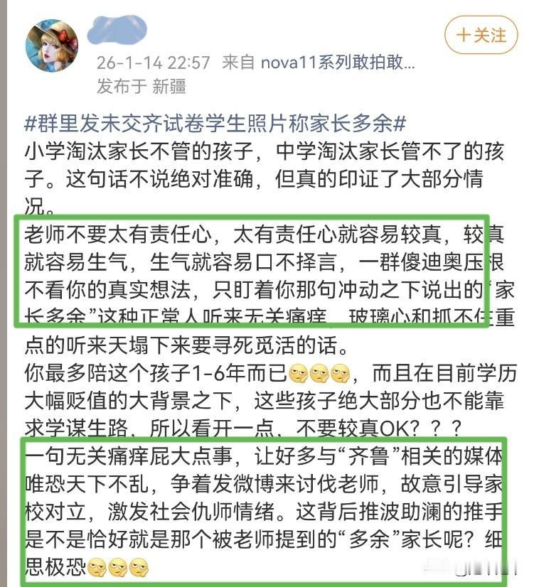 这样的教师该“退群”吗? 贵州省安顺市紫云自治县第三小学一名班主任在班级微信群公开16名未带齐试卷的学生照片,该名班主任阮某某在班级群发布未交齐试卷的16名学生集体照片,配文称“以上家长可以退群,因为你们在群里多余,未将信息传达给孩子”。群里寂静无声,没有一位家长发言。 事件在经媒体报道后,阮某某解释其本意是“提醒家长注重孩子学习”,并非真正要求家长退群。教育局已责成校方调查核实。 理解老师要督促学生完成作业,完全支持老师严格要求,是对学生们的认真负责方式。但这样的处理错误的方式,把孩子们像犯人一样拍照发到上百人的大群里公开示众,让孩子们的心灵上种下一颗“毒刺”这样有利于孩子们的身心健康? 教育者本该用合理的方案把长偏了的树枝纠正,而不是用斧子剔除掉歪了的树枝。照片公示也许能换来短期内作业交齐的表象,但失去的是孩子们昂首挺胸走在校园里的底气,会让孩子们产生弃学厌学的心态。 孩子们不交作业肯定是有各种各样的原因,难道不能私下了解一下原因后补交作业?反过来想想看一个班数十名学生,不交作业的就有十几个人,这和这位老师的教课方式没有一点关系? 还有“理中人”在说:老师不要太有责任心,太有责任心就容易较真,较真就容易生气,生气就容易口不择言。这是媒体在挑动引导家校对立,激发社会仇师情绪。真想抽这样的博主一个大嘴巴子。真心希望他们家的孩子能遇见一个没有责任心的班主任。 教育者必须要严管与尊重并行,教师应避免情绪化表达,多采用沟通交流等更人性化方式,教育需要严格,但绝不应以牺牲学生尊严为代价。