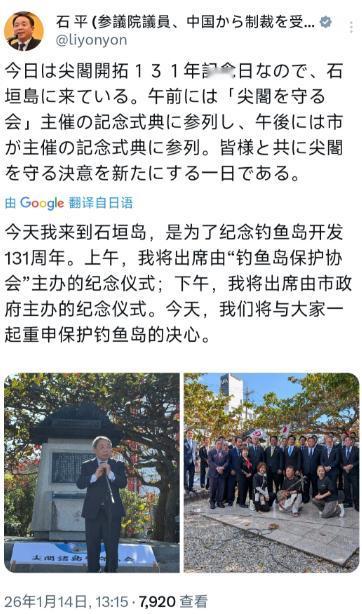 被我方制裁的大汉奸、日本参议员石平今天(1月14日)发文写道:“今天我来到石垣岛,是为了纪念尖阁列岛(我方称钓鱼岛)开发131周年。上午,我将出席由‘尖阁列岛保护协会’主办的纪念仪式;下午,我将出席由市政府主办的纪念仪式。今天,我们将与大家一起重申保护尖阁列岛的决心。” 2026年1月14日,日本参议员石平高调宣称抵达石垣岛,参加所谓“尖阁列岛(中国称钓鱼岛)开发131周年”纪念活动。 他计划出席由右翼团体“尖阁列岛保护协会”主办的仪式,并参加市政府组织的活动,声称要“重申保护尖阁列岛的决心”。 这一行为看似是政治作秀,实则延续了其长期挑衅中国主权、迎合日本右翼的一贯套路。 然而石平的身份背景让这场表演显得格外讽刺,他1962年生于四川成都,毕业于北京大学哲学系,曾是中国公民。 1988年赴日留学后,他于2007年加入日本国籍,此后不断通过否定南京大屠杀、支持参拜靖国神社、鼓吹“钓鱼岛属日”等言论博取关注。 2025年7月当选日本参议员后,他更频繁地插手台湾、涉疆等问题,甚至公然参拜靖国神社,最终在同年9月8日被中国外交部依据《反外国制裁法》实施制裁,包括冻结在华资产、禁止交易合作及入境等措施。 说白了,一个靠出卖良知换取政治筹码的人,如今不过是在重复早已被揭穿的谎言。 石平的选择并非偶然,与其说他是“理念的追随者”,不如说是“机会的投机者”。 他曾在书中写道“出生于中国是一生的遗憾”,但这类极端言论连日本主流社会都难以接纳——其著作《我为何抛弃中国》在日本市场遇冷,甚至有日本网民指责他“数典忘祖”。 此次高调参加石垣岛活动,无非是想借领土议题煽动对立,巩固自身政治地位。 但现实是,无论怎样包装,钓鱼岛及其附属岛屿都是中国固有领土,有充分的历史和法理依据,石平的表演既改变不了事实,也无法赢得尊重。 值得注意的是,石平的政治空间并不宽敞,日本国会中,新生议员通常需多年积累才能获得话语权,而石平所在政党日本维新会的影响力有限,其激进立场甚至引发日本国内批评。 中方此次制裁已明确划出红线:任何挑战中国主权和领土完整的行为必将遭到反制。 换句话说,石平之流的闹剧只会让更多人看清,背叛民族、煽动对立的人终将自食其果。 今天石平在石垣岛的“纪念”,不过是一场刻意设计的政治操弄。 但历史的真相不会因几句喧哗而改变,钓鱼岛的归属更不容篡改。 对于石平来说,或许更该思考的是:当政治投机耗尽最后一丝信誉,还能留下什么? 以上都是个人观点,对此您有什么不同的看法,可以在评论区留言讨论!!!