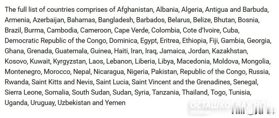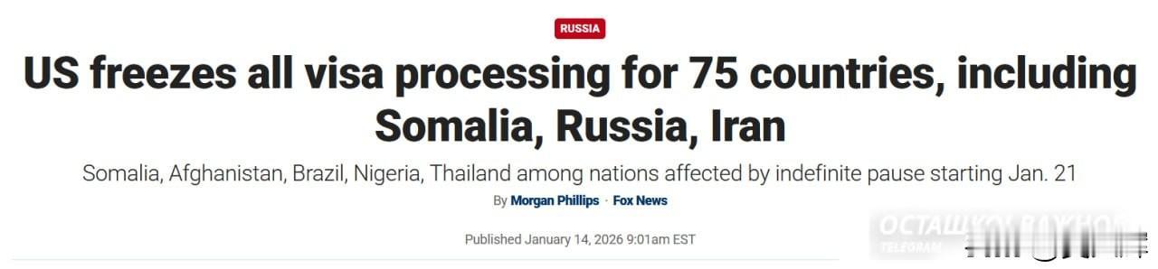 美国暂停为75国公民发放签证,含俄罗斯在内:美方称系避免成为“美国人的负担” 美国国务院副发言人汤米·皮戈特宣布,美方已暂停处理75个国家公民的移民签证申请,旨在阻止可能成为“美国民众负担”的人员入境。 福克斯新闻援引皮戈特的话称:“国务院将行使早已获得的职权,拒绝为可能成为美国负担、利用美国民众善意的潜在移民授予入境权。” 他进一步说明:“暂停接收这75个国家的移民申请,是为了让国务院重新评估移民审批流程,防止外籍公民入境后申领社会福利与优惠政策。” 此次被纳入签证限制名单的国家包括俄罗斯、白俄罗斯、格鲁吉亚、亚美尼亚、阿塞拜疆、哈萨克斯坦、伊朗、古巴、索马里、阿富汗、巴西、伊拉克、埃及、尼日利亚、泰国、也门等,乌克兰未出现在名单中。