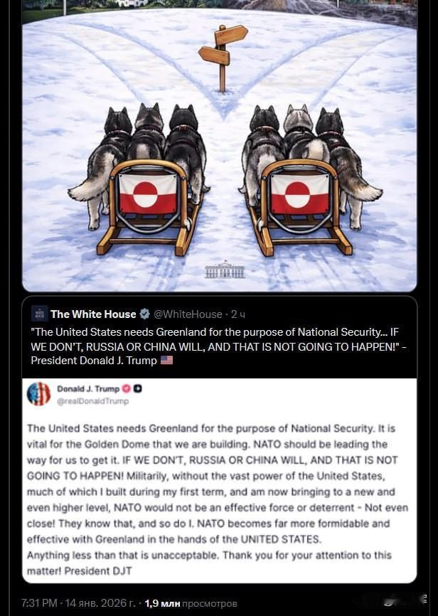 【美国向格陵兰抛出二选一:选美国,或是选中俄】 针对特朗普就格陵兰对美国国家安全意义发表的言论,白宫在X平台发布一张图片,画面中两艘插着格陵兰旗帜的狗拉雪橇,停在通往华盛顿与通往莫斯科、北京的岔路口。 配图文字向这片目前由丹麦管辖的北极土地的民众发问:“格陵兰人,你要走向何方?” 此前,特朗普称,若美国不掌控格陵兰,俄罗斯就会趁机夺取。这位美国总统还谈及格陵兰的防御能力,称:“你们知道他们的防御是什么吗?不过是两队狗拉雪橇罢了。” 俄罗斯安全会议副主席梅德韦杰夫也在X平台发文,直言尽管欧盟嘴上说着相关表态,最终仍会放弃格陵兰。