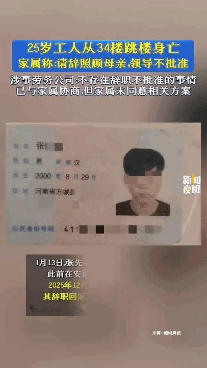 这件不幸的事情发生在2025年12月27日晚,昨天小伙的家属接受了记者的采访,很多媒体报道了此事,引起社会关注。安徽芜湖,25岁小伙从34楼坠楼身亡。只因要辞职回家照顾生病的母亲,但申请多次公司却不批准,而且误工一天要罚三天工资。所在公司说:跟劳务中介签的合同;劳务中介说:没有不批! 有网友表示:建议国家取消劳务中介,用人单位直接招人,不准中介插手,打工者的收入就能提高,对打工者有好处,对企业也有好处。 坚决取缔劳务中介,我儿子也是30多岁,在单位一直是临时工,也是外包劳务中介招聘工厂的,跟正式职工待遇不一样,没有五险一金,不给买! 谁说的辞职需要批准?劳动法明确规定,员工离职只需要向公司递交离职通知,该交接的事项准备好,领导不批可以直接走人,公司事后找麻烦,劳动仲裁一告一个准。 所谓劳务派遣,劳务外包就是变象的周扒皮,没有五险一金,更没休息,每天工作时间长,工时工资少!完全没有享受国家的劳动法保障。这就是现实当中的黑暗的劳务公司! 对此大家怎么看呢