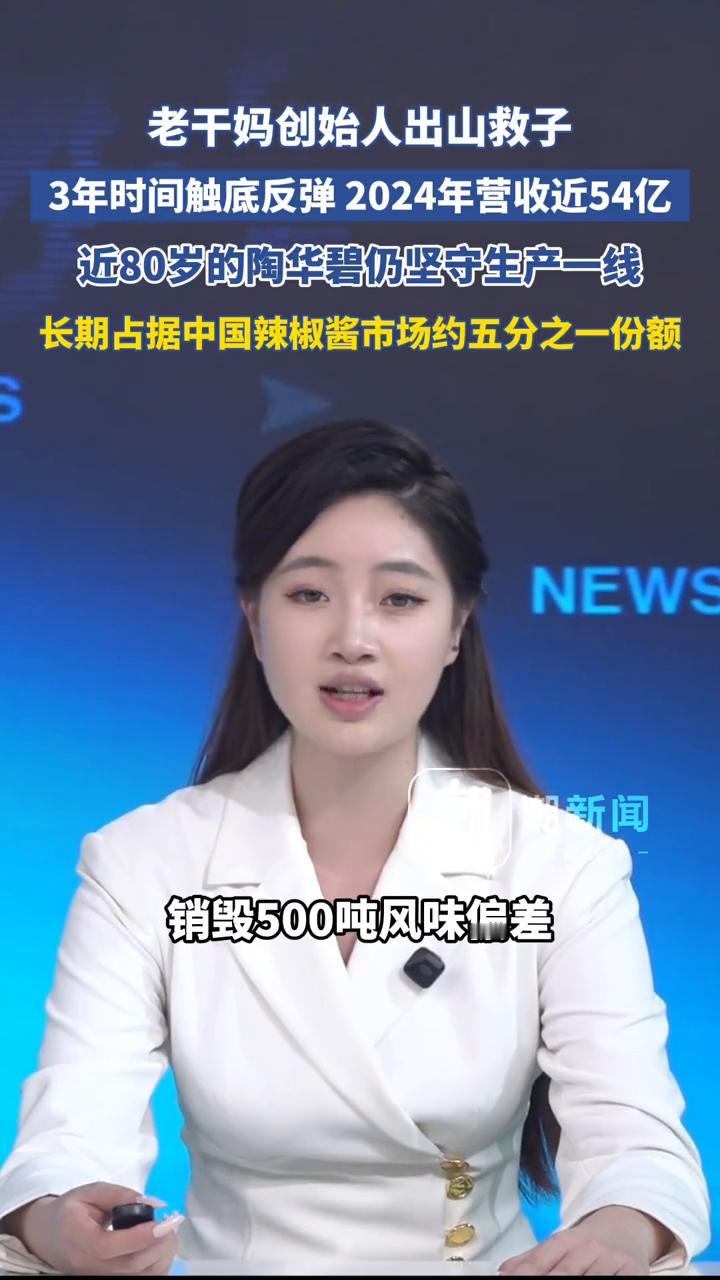 3年时间触底反弹,2024年营收近54亿。 老干妈创始人"出山救子",3年以54亿营收重回巅峰,近80岁的陶华碧仍坚守生产一线。 据南风窗1月13号报道,《2025贵州企业100强》显示,老干妈2024年营收达53.91亿元,直逼历史峰值,距2021年42亿元低谷仅3年。 2014年,陶华碧将企业交棒到两个儿子手上,接班人为降本,将贵州辣椒换成河南辣椒,致风味流失,口碑暴跌。2019年72岁陶华碧重回一线,停用低价辣椒,全面恢复优质辣椒原料,销毁500吨风味偏差价值百万的产品。有员工认为,一般消费者尝不出来销毁太可惜。 陶华碧表示,做食品要讲诚信,要对得起良心。老干妈大幅减少营销,专注产品本身,长期占据中国辣椒酱市场约五分之一份额,风靡海外市场。 老干妈风味 经典老干妈 老干妈发展史
