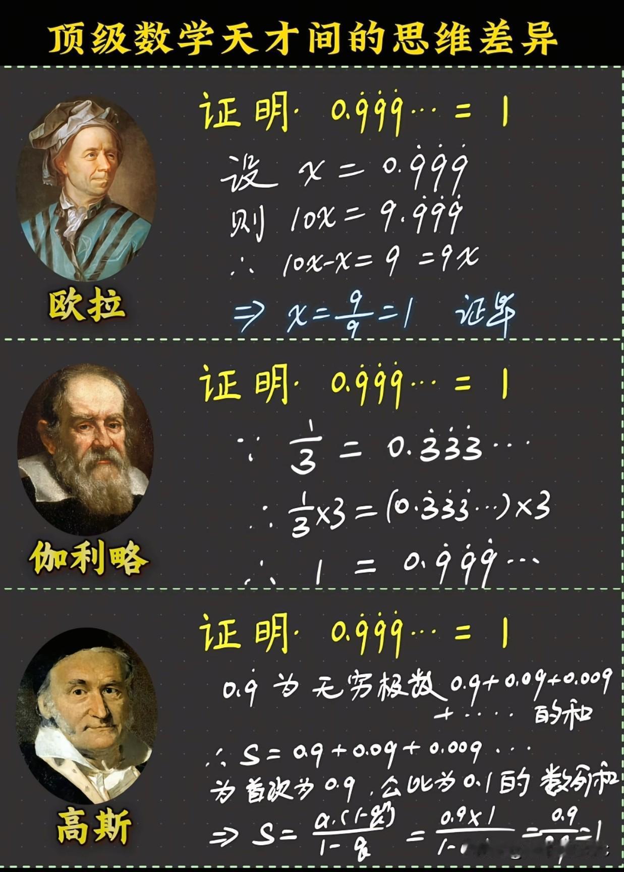 一张图看懂三位天才如何“吵架”:原来顶级大脑,也偏爱走不同的路! 看到这张图,瞬间梦回初中数学课!那个让无数人挠头的问题——0.999…到底等不等于1——在顶级天才手里,竟然能玩出三种截然不同的“花活”。 先说欧拉,数学界的“计算器”。他的证明充满理工男的直接:设未知数,做个减法,搞定。10x - x = 9,干净利落,逻辑链条短得像一道闪电。他根本不屑和你争论无限循环,直接用代数规则“暴力破解”,简洁到令人惊叹。 再看伽利略,科学实验之父。他的视角最是刁钻巧妙:从分数切入,借力打力。你不是怀疑0.999…吗?那1除以3等于0.333…总没争议吧?三倍回来,自然就是1。这解法妙在“化敌为友”,把难题瞬间转化为一个普遍接受的常识,充满了四两拨千斤的智慧。 最后是高斯,“数学王子”。他的方法最“高大上”,也最严谨:用无穷级数,正面强攻。他把0.999…拆成0.9+0.09+0.009+…,然后搬出等比数列求和公式,在严格的数学框架下完成“绝杀”。这是将直觉认知彻底公理化的过程,展现了现代数学的坚实骨架。 最欣赏谁?作为一个“过来人”,我反而最服伽利略。欧拉的证明需要一点代数技巧,高斯的解法需要级数知识门槛,而伽利略的证明,是真正能让一个初中生、甚至一个聪明的孩子在几秒内“啊哈!”一声顿悟的魔法。它不需要复杂的运算,只用一个已被广泛接受的等式(1/3=0.333…),就构建了无懈可击的逻辑桥梁,把深奥的“无限”概念,变得像“三个苹果分给三个人”一样直观、亲切、无可辩驳。 这恰恰揭示了天才思维最迷人的差异:有人善于构建体系(高斯),有人精于简化计算(欧拉),而有人,则拥有那种穿透表象、将复杂归于最朴素常识的惊人洞察力(伽利略)。这道题没有输赢,但伽利略的解法,赢得了最多“原来如此”的会心一笑。这就是思想的魅力。