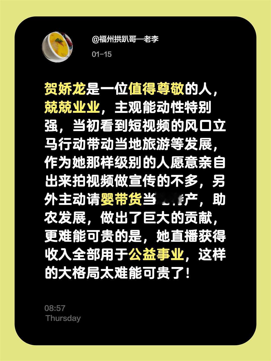 贺娇龙是一位值得尊敬的人,兢兢业业,主观能动性特别强,当初看到短视频的风口立马行动带动当地旅游等发展,作为她那样级别的人愿意亲自出来拍视频做宣传的不多,另外主动请婴带货当地特产,助农发展,做出了巨大的贡献,更难能可贵的是,她直播获得收入全部用于公益事业,这样的大格局太难能可贵了!