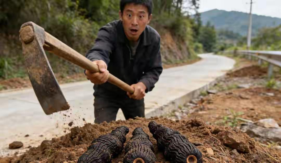 四川达州修路现场惊现“黑金疙瘩”!男子一挖斗下去,疑似挖出天价野生乌灵参,网友炸