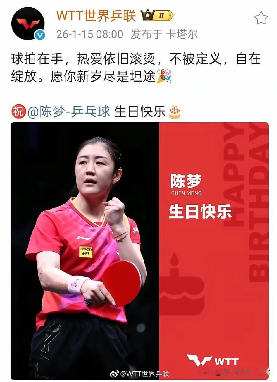 祝陈梦生日快乐! 今天是陈梦生日,WTT发文评价她“球拍在手,热爱依旧滚烫,不被定义,自在绽放。” 陈梦从东京到巴黎,蝉联两届奥运女单冠军,实现人生辉煌,全凭着“热爱依旧滚烫”的执着。 久疏战阵的陈梦全运会复出,就打进三强,战胜刚刚在多哈冠军赛夺冠的朱雨玲,再次展现奧运冠军风彩。 正如WTT发文那样,陈梦“不被定义,自在绽放”,无论陈梦做出什么选择,我们都祝愿她顺遂如意,自在绽放,生日快乐!