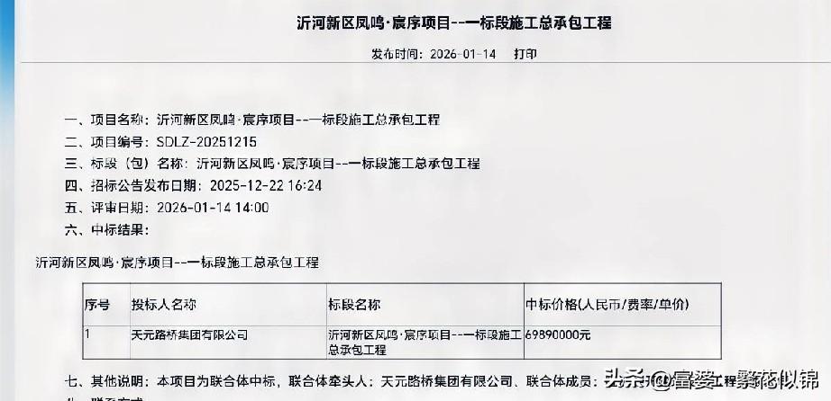 天元路桥集团中标沂河新区高品质住宅项目 近日,临沂某招标采购平台发布中标结果公示,由临沂本地最大建筑企业天元路桥集团中标沂河新区国有企业开发的凤鸣宸序项目一标段的施工总承包工程。 中标金额六千九百多万,又是一笔不小的工程款,天元员工们有福了,工资、五险一金、年终奖都跑不了了。 监理单位是山东高速建设科技有限公司,也是国企控股,三大企业强强联合,这个高品质住宅项目质量要求将会更加严格把关。