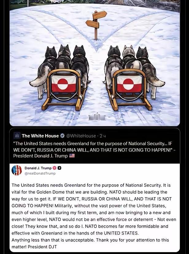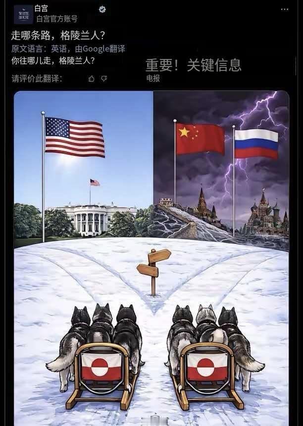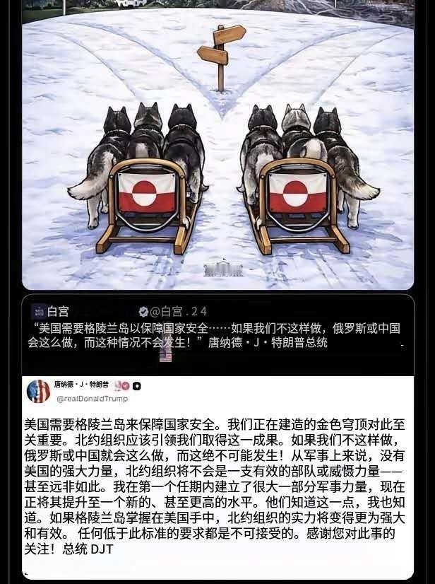 白宫给格陵兰岛两条出路,一边是美国,一边是中俄,唯独没有欧洲! 如果是美国一般媒体的漫画也就算了,关键是白宫的官方账号!只给了格陵兰岛两条出路,配文字说:走哪条路,格陵兰人?往哪边走,格陵兰人?图一、三。 特朗普还亲自转发并加了很长一段文字(图2.4):美国需要格陵兰岛来保障国家安全。我们正在建造的金色穹顶对此至关重要。北约组织应该引领我们取得这一成果。如果我们不这样做,俄罗斯或中国就会这么做,而这绝不可能发生!从军事上来说,没有美国的强大力量,北约组织将不会是一支有效的部队或威慑力量甚至远非如此。我在第一个任期内建立了很大一部分军事力量,现在正将其提升至一个新的,甚至更高的水平。他们知道这一点,我也知道。如果格陵兰岛掌握在美国手中,北约组织的实力将变得更为强大和有效。任何低于此标准的要求都是不可接受的。感谢您对此事的关注!落款是:总统DJT 你看,格陵兰岛只有归入美国版图一条道了! 我突发好奇,如果格陵兰岛人或者丹麦就是选择了东大,你说那会怎么样?是不是就热闹了?