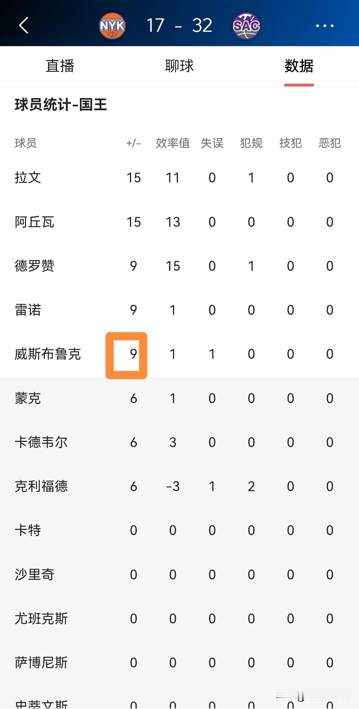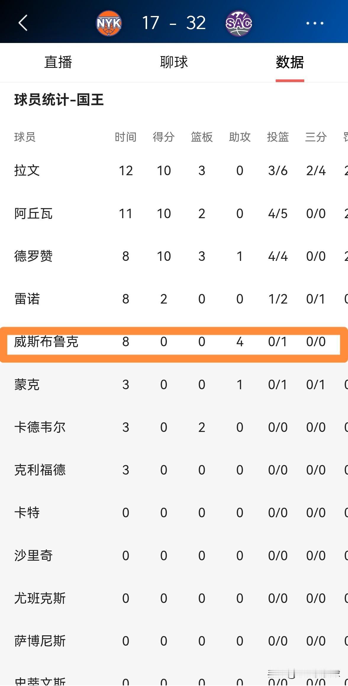 国王球星威斯布鲁克真是太合理了!在今天国王主场迎战尼克斯的比赛中,目前双方的首节比赛已经结束,国王以32:17领先对手15分。在第一节比赛中,威少打得非常合理,他专注于组织串联将球队的进攻梳理的井井有条,他在首发出战的8分钟里,仅仅出手了1次没有得分,不过有4助攻,他的场上正负值为+9。 事实再次证明,当威少能够以正确合理的方式打球时,他的场上效果会非常的好,球队会因此而受益匪浅。
