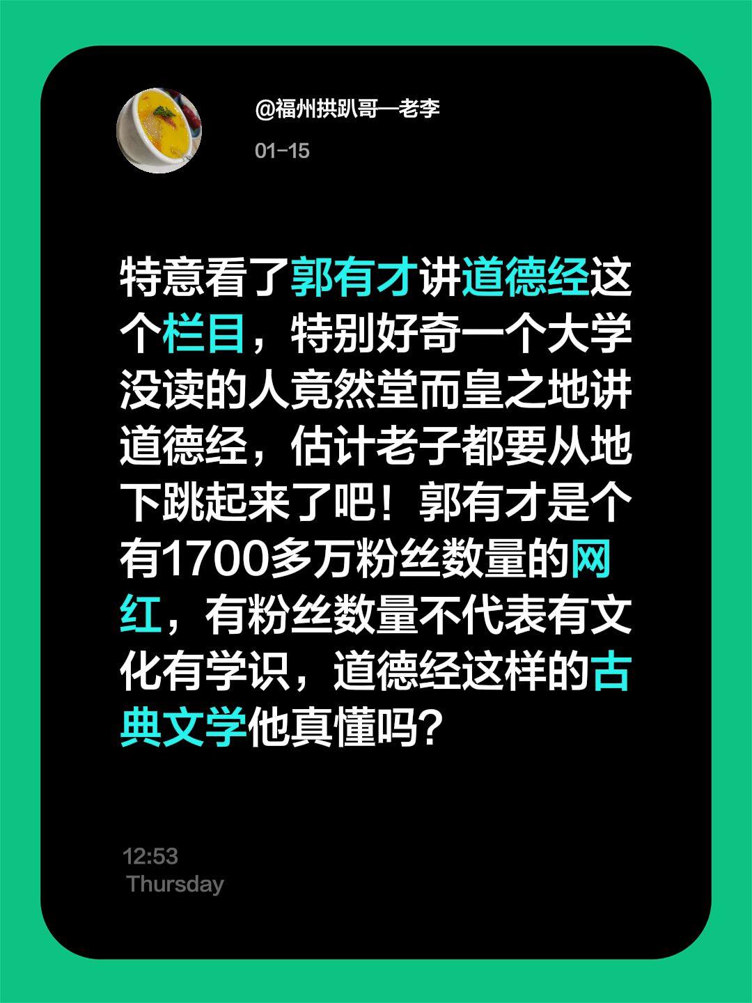 特意看了郭有才讲道德经这个栏目,特别好奇一个大学没读的人竟然堂而皇之地讲道德经,估计老子都要从地下跳起来了吧!郭有才是个有1700多万粉丝数量的网红,有粉丝数量不代表有文化有学识,道德经这样的古典文学他真懂吗?郭有才