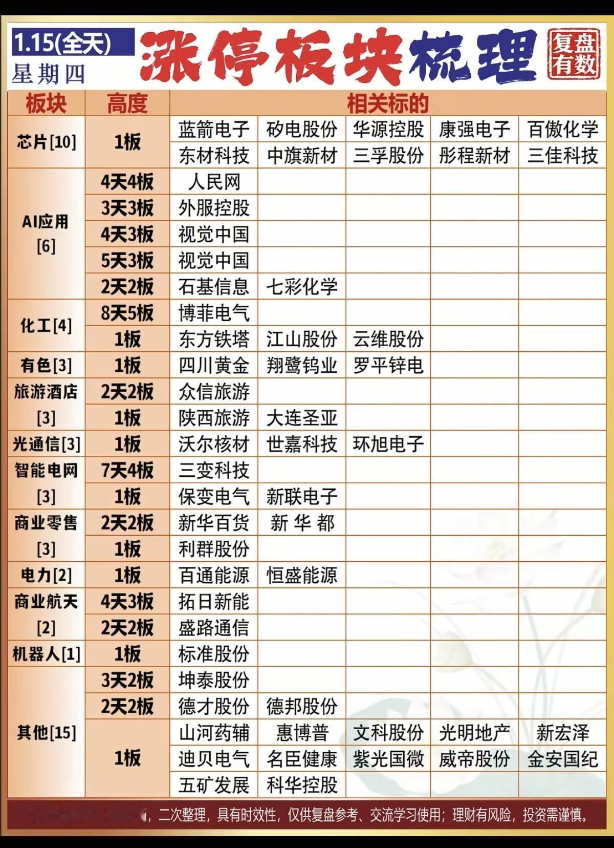1.15周四 涨停板股票:题材分布! 涨停板55家 跌停家数63家 涨跌比2168:2898 半导体 10股涨停 人工智能AI 6股涨停 化工原料 4股涨停 有色金属 3股涨停