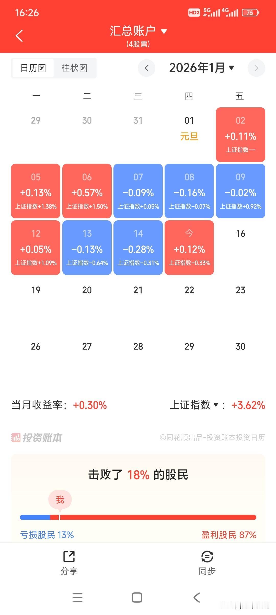 昨天有好心的股友劝我趁现在还有点盈利赶快离开股市,否则明天就跌没了。投资是一场比马拉松还马拉松的比赛,不是看某天、某月、某年的收益,没有人能保证每年都盈利,只要我们能做到大部分的年份盈利,少许年亏损,争取少有的亏损年仅是小亏,我相信我们能穿越牛熊周期,坚信我们能战胜大盘,战胜绝大部分的股友。 今天账户微红,本月、今年暂时还盈利,今年仅有13%的股民亏损,看来喜欢老登股的股民越来越少,难怪老登股跌跌不休。