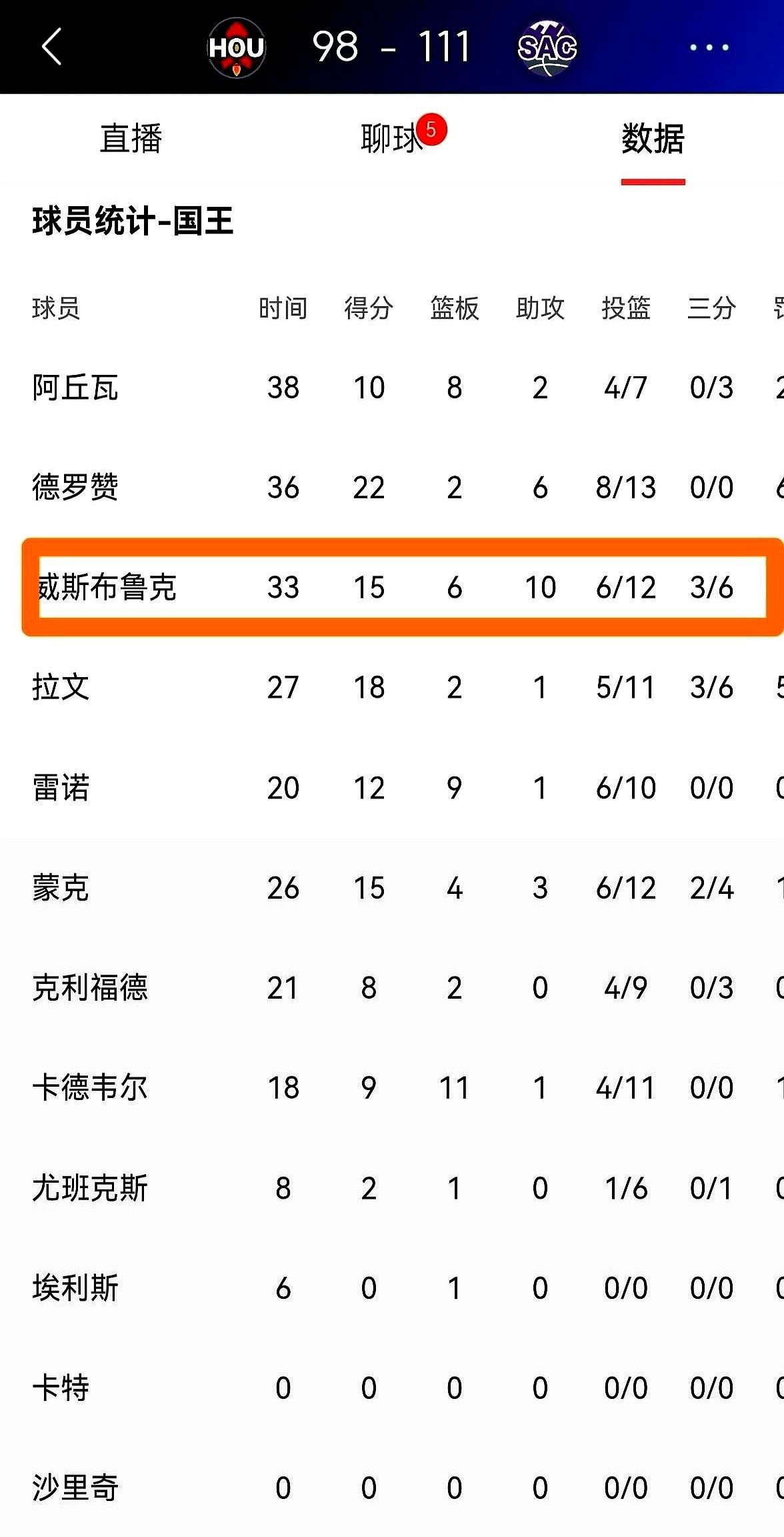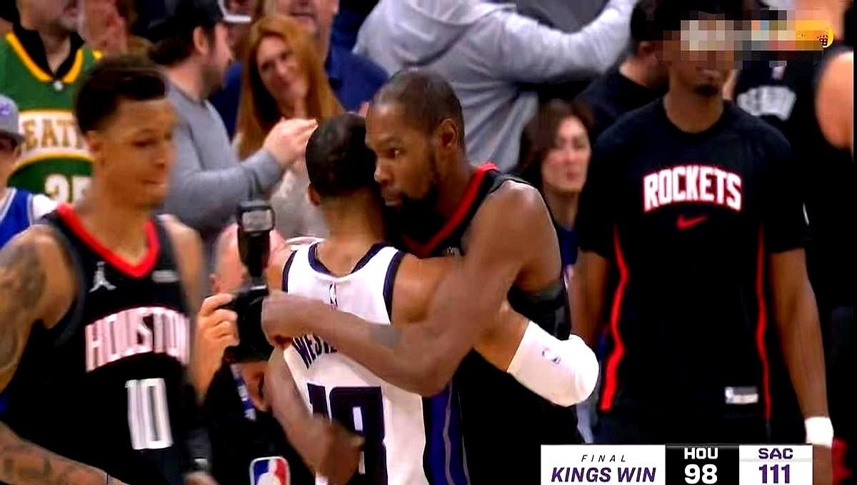 这已经是国王本赛季第二次在主场办了火箭! 威少今晚就一件事:死磕杜兰特! 从开场哨响,他就跟铁链子似的缠着阿杜,几乎不给呼吸空间。自己进个球,立马捶胸庆祝,那股“我非赢你不可”的劲儿,全场都看得见。 谁能想到?一支7连败、西部垫底的球队,就这么硬生生把火箭给拽下来了。 威少全场送出15分10次助攻,队友德罗赞还顺手拿到了生涯第26000分,全队都疯了! 杜兰特拿到23分,但末节火箭进攻突然断电,他看着也挺无奈。 终场哨响,111-98。哥俩最后还是拥抱致意,场上是对手,场下这关系……还真不好说。