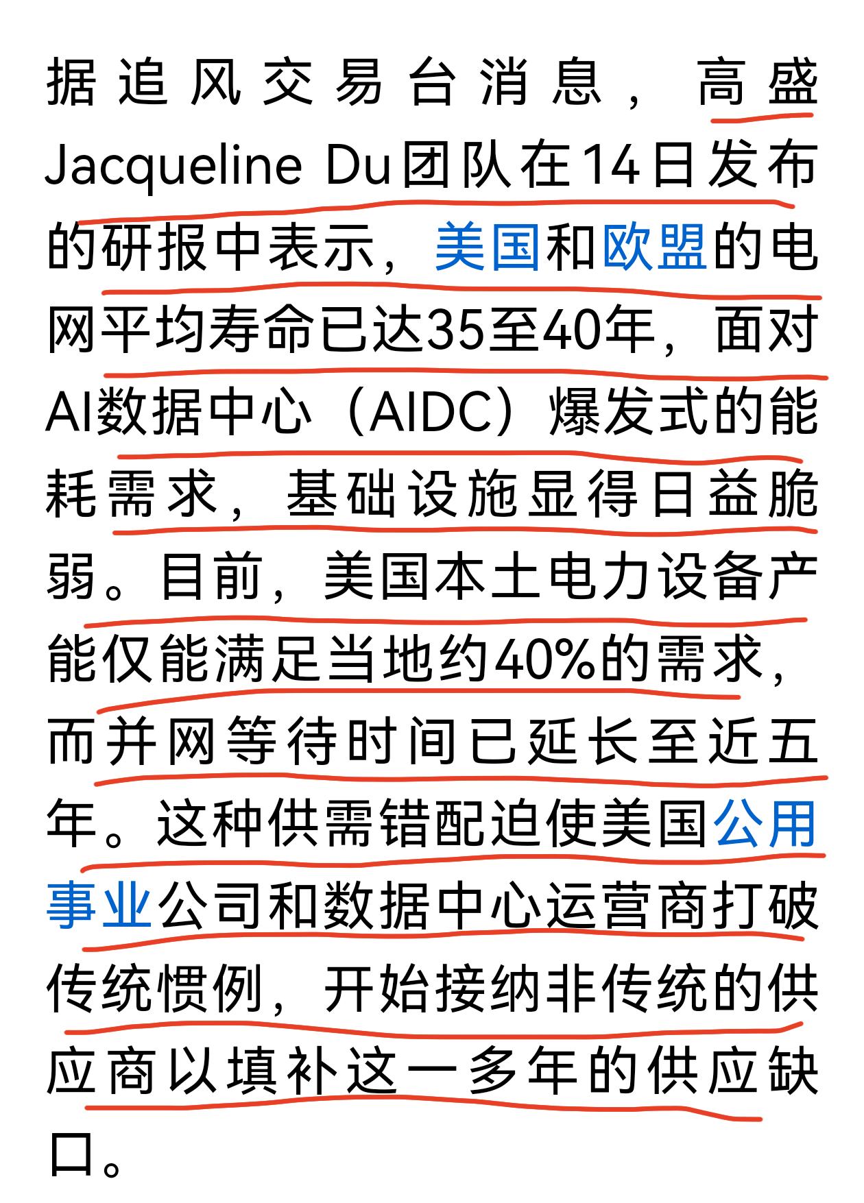 高盛:中国电力产业链遇历史性机遇。美国最大电网或面临轮流停电,欧美的老电网遇到A