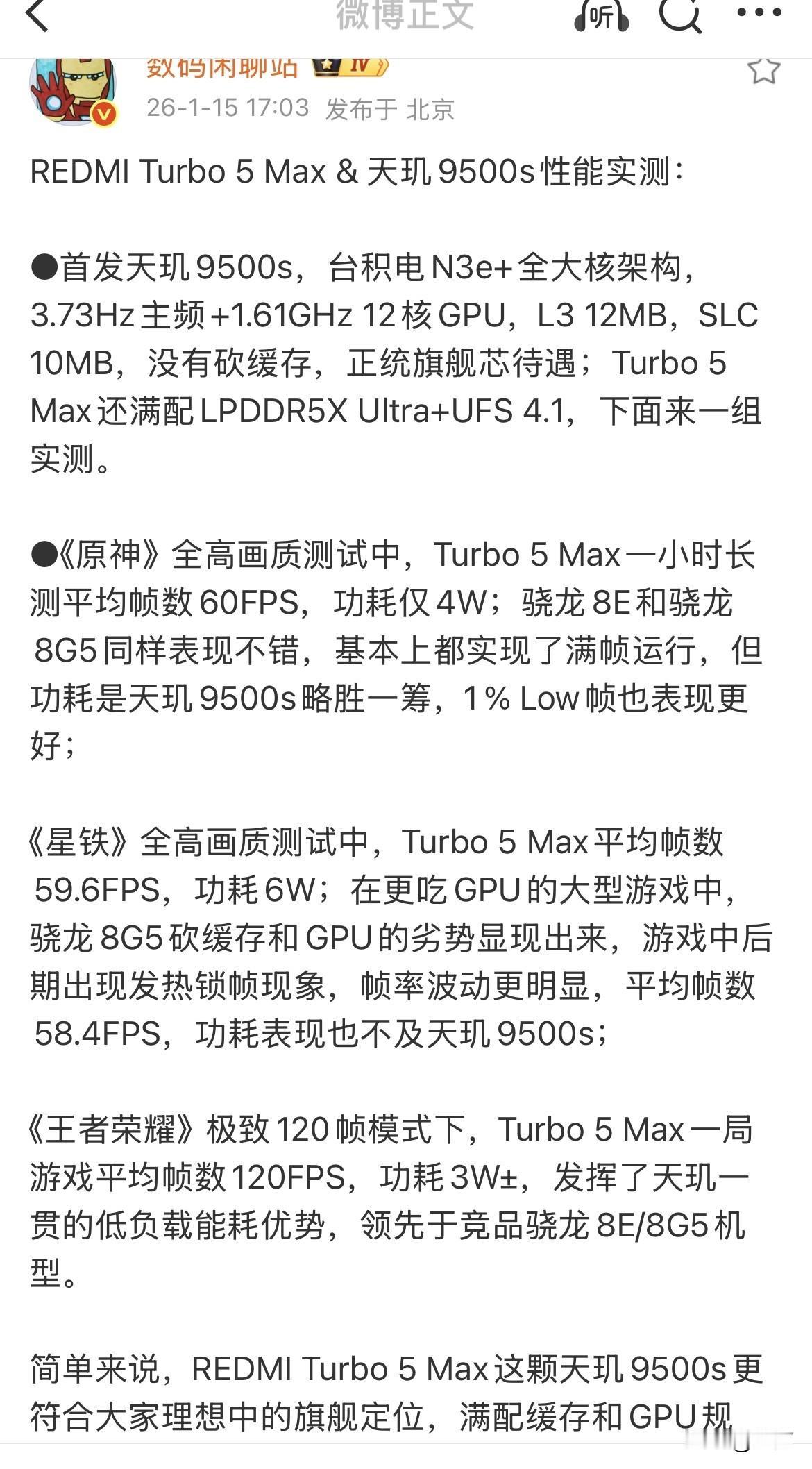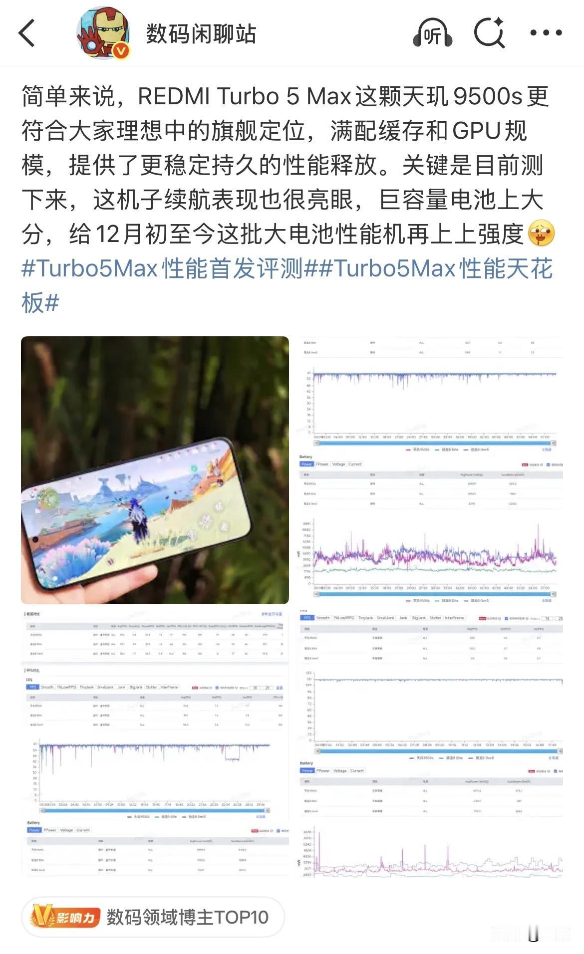 数码博主:REDMI Turbo 5 Max这颗天玑9500s更符合大家理想中的旗舰定位! 就在刚才数码博主放出了,根据他测试的各个版本来看,9500s整体的性能对比9400+还是有提升的,但是要说很明显也算不上。那就可以看看第三张图片,这个测试和9400 +的有多参数基本上差不多。 所以目前大家都猜测他的价格范围,有人说可能2300左右,有人说估计可能还会往下面降一点点。 当然,实在要比较的话,和8g5比还是要强一点点,毕竟D9500s的GPU,规模和缓存都是满的,所以他们之间还是有一点点微妙的差距的。 虽然最终他的电池参数规模还没有出来,但是也可以猜得到,估计就是9000多的范围。