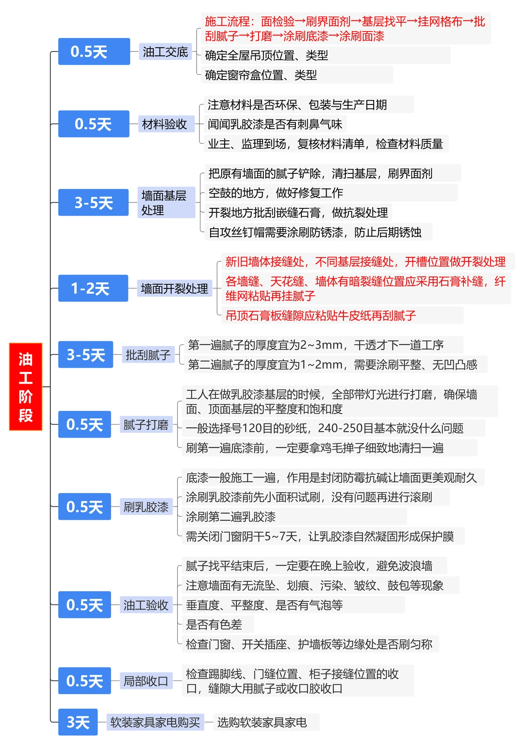 重点提示: 刷漆前检查墙面平整度,乳胶漆色号最后确认。刷完后关窗阴干,避免开裂。