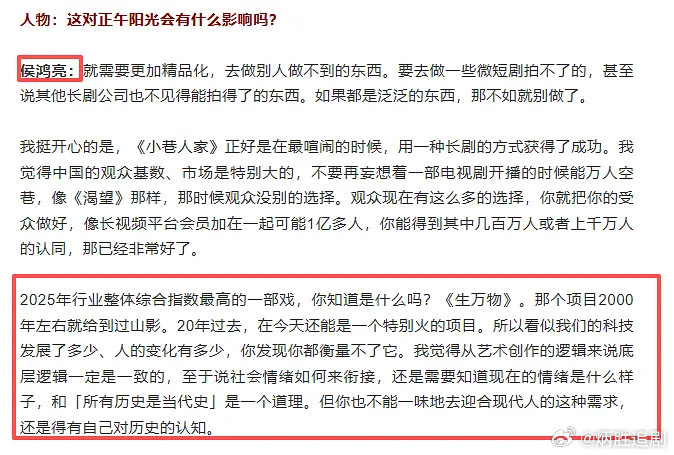 业内都知道《生万物》牛啊!侯鸿亮说2025年行业整体综合指数最高的一部戏是《生万物》
