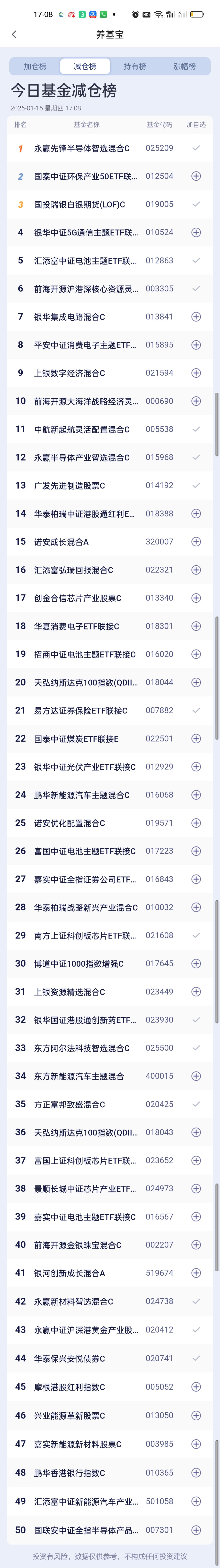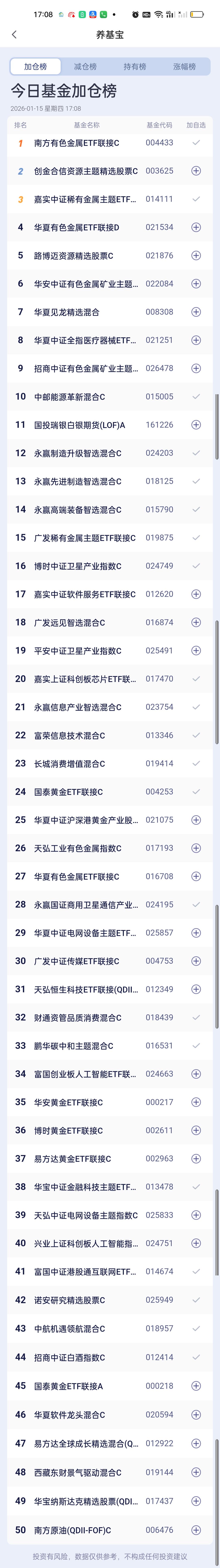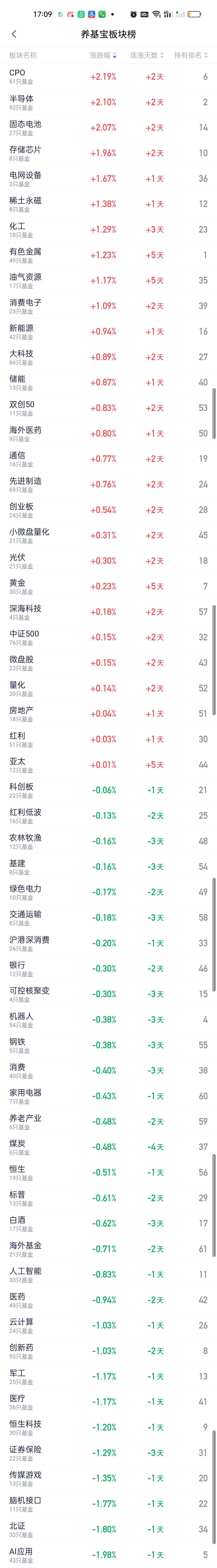 今日基金加仓榜,减仓榜,板块榜以及估值榜已全部更新完毕。加仓榜前三名是南方有色金属ETF联接,创金合信资源主题,嘉实中证稀有金属主题。 减仓榜前三名是永赢先锋半导体,国泰中证环保产业,国投瑞银白银期货。 板块榜来看,CPO,半导体,固态电池,存储芯片,电网设备,稀土永磁,化工,有色金属,油气资源,消费电子涨幅居前,商业航天,金融科技,AI应用,北证,脑机接口,传媒游戏,证券保险,恒生科技,医疗,军工,创新药,云计算跌幅靠前。