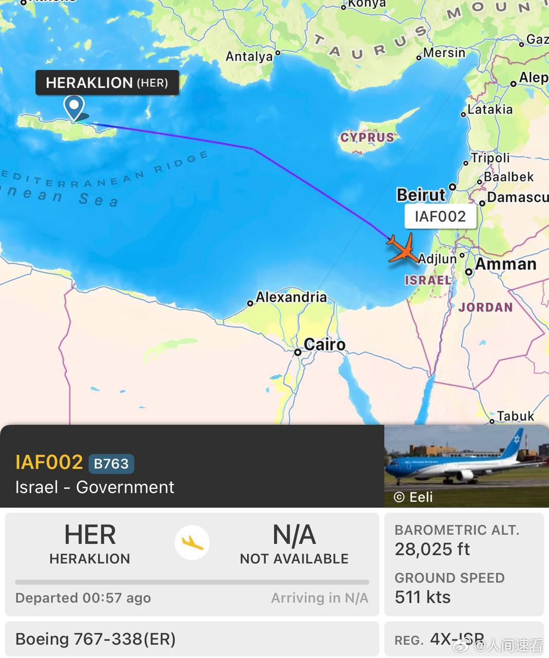 曝以总理专机已离开以色列以色列波音767-338ER型客机(绰号"锡安之翼")该机型是总理和总统专用的空军一号座机今日从以色列南部的内瓦提姆空军基地起飞,飞往希腊克里特岛波音767客机在希腊降落后,迅速折返,目前正返回以色列。这是以色列空军的一次"疏散演习",上次对伊朗展开行动前就做过一样的测试了