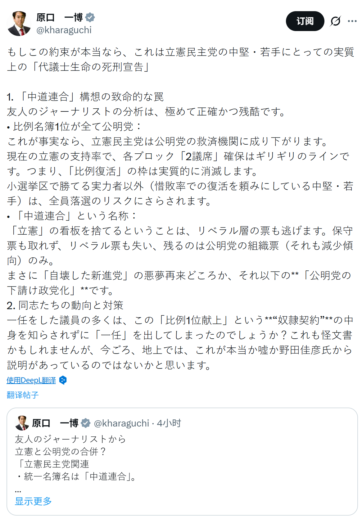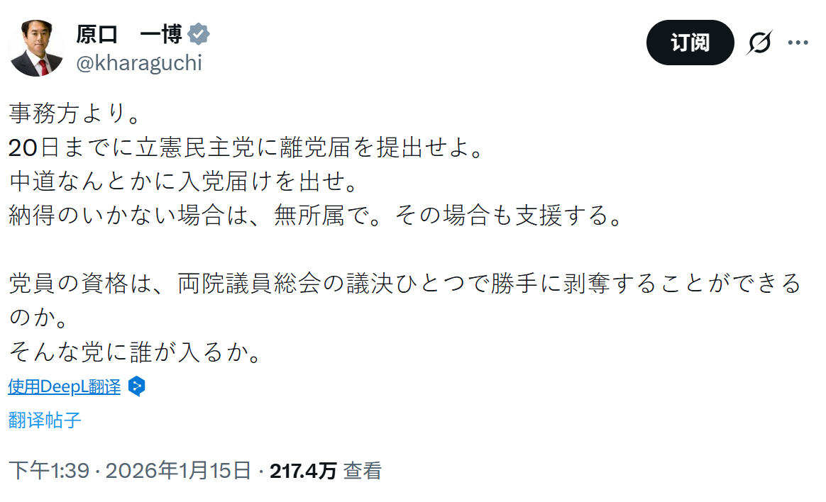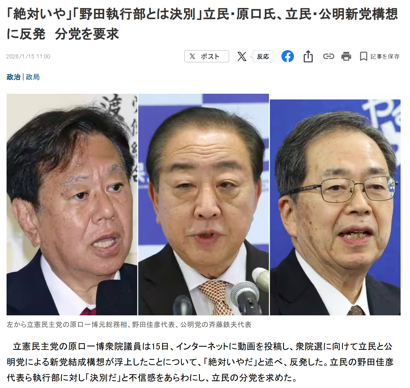 立民议员原口一博怒喷立民和公明成立新党,已经被通知要求退党加入新党了