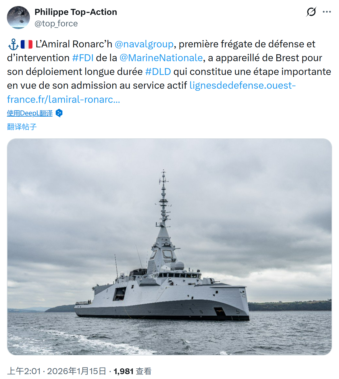 法鸡首艘FDI——FS Amiral Ronarc’h(D660)开始为期数月的部署任务,期间预计将访问瑞典,为FDI方案竞标瑞典护卫舰项目造势