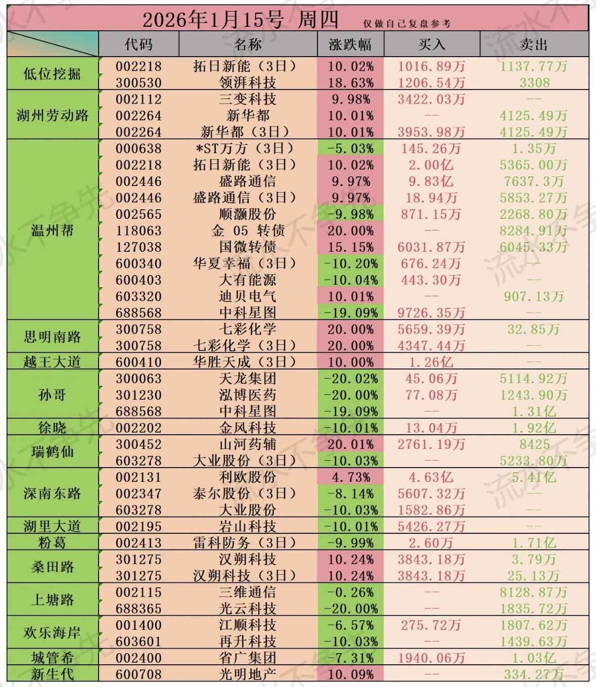 2026年1月15日股票涨跌榜,带你一探究竟!📈📉 "股市复盘笔记:多股涨跌显著,盛路通信领涨,雷科防务回调,资金动向活跃,短线博弈加剧。" 股市复盘:多股涨跌分化,盛路通信领涨,红相股份重挫,资金博弈激烈,关注板块轮动机会。