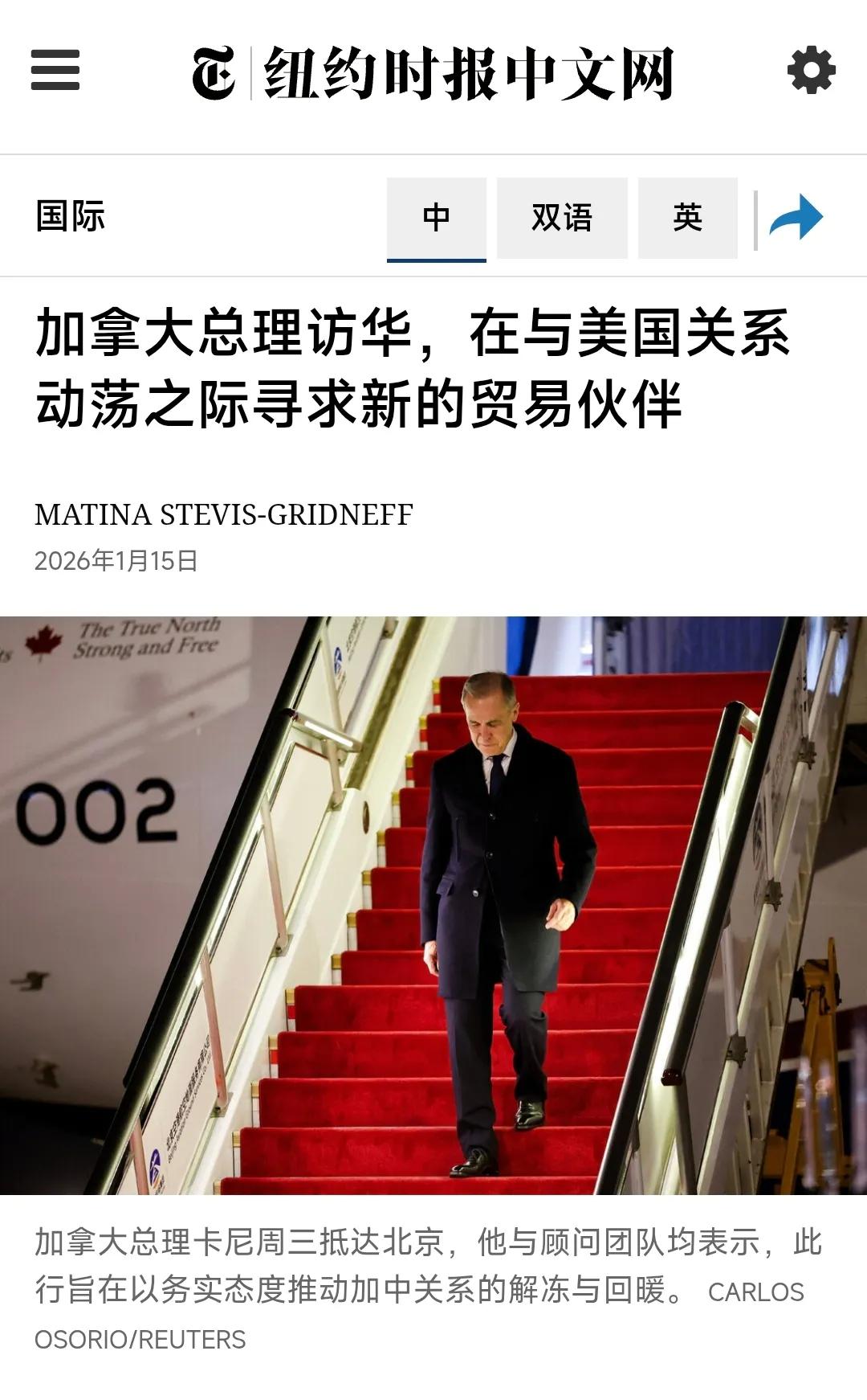 1月15日,美国媒体报道称:“加拿大总理马克·卡尼周三抵达北京,展开为期三天的国事访问。期间他将与中方会晤,并致力于修复两国之间的关系。随着美国不再是加拿大可靠的盟友,中加关系如今可能更为关键。” 时隔八年加拿大总理访华,对于加拿大来说是一件具有里程碑意义的访问,尤其是当下加拿大和美国的复杂关系,选择远渡重洋来访问中国,总比看美国的脸色,遭到美国的压榨要好的多的多。 加拿大作为美国的邻邦,长期以来受制于美国盟友的领导,现在风向陡然转变,面对特朗普对加拿大的不友好动作,加拿大急需要寻求与东方大国的破冰之旅。 特朗普的一系列操作,也让加拿大认清了美国盟友的做法并非一成不变的,在霸凌面前,加拿大只有绝对的服从,哪里有享受平等相待之道,更多时候只有泪水和屈辱。 卡尼访华受到了我国高规格接待,双方谈合作,谈发展,在一些有着广泛合作基础的领域,望能够重回健康发展轨道。希望加拿大的这次主动示好中国行径,在今后能够一如既往的保持好,不要返回后受到美国的干扰,再作出有损两国利益的事情来。