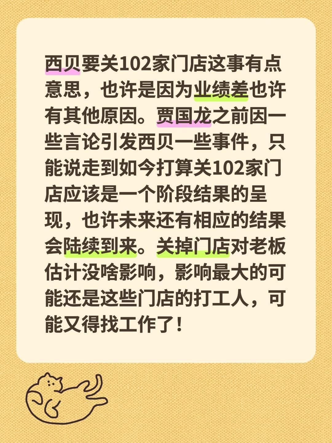 西贝要关102家门店这事有点意思,也许是因为业绩差也许有其他原因。贾国龙之前因一些言论引发西贝一些事件,只能说走到如今打算关102家门店应该是一个阶段结果的呈现,也许未来还有相应的结果会陆续到来。关掉门店对老板估计没啥影响,影响最大的可能还是这些门店的打工人,可能又得找工作了!