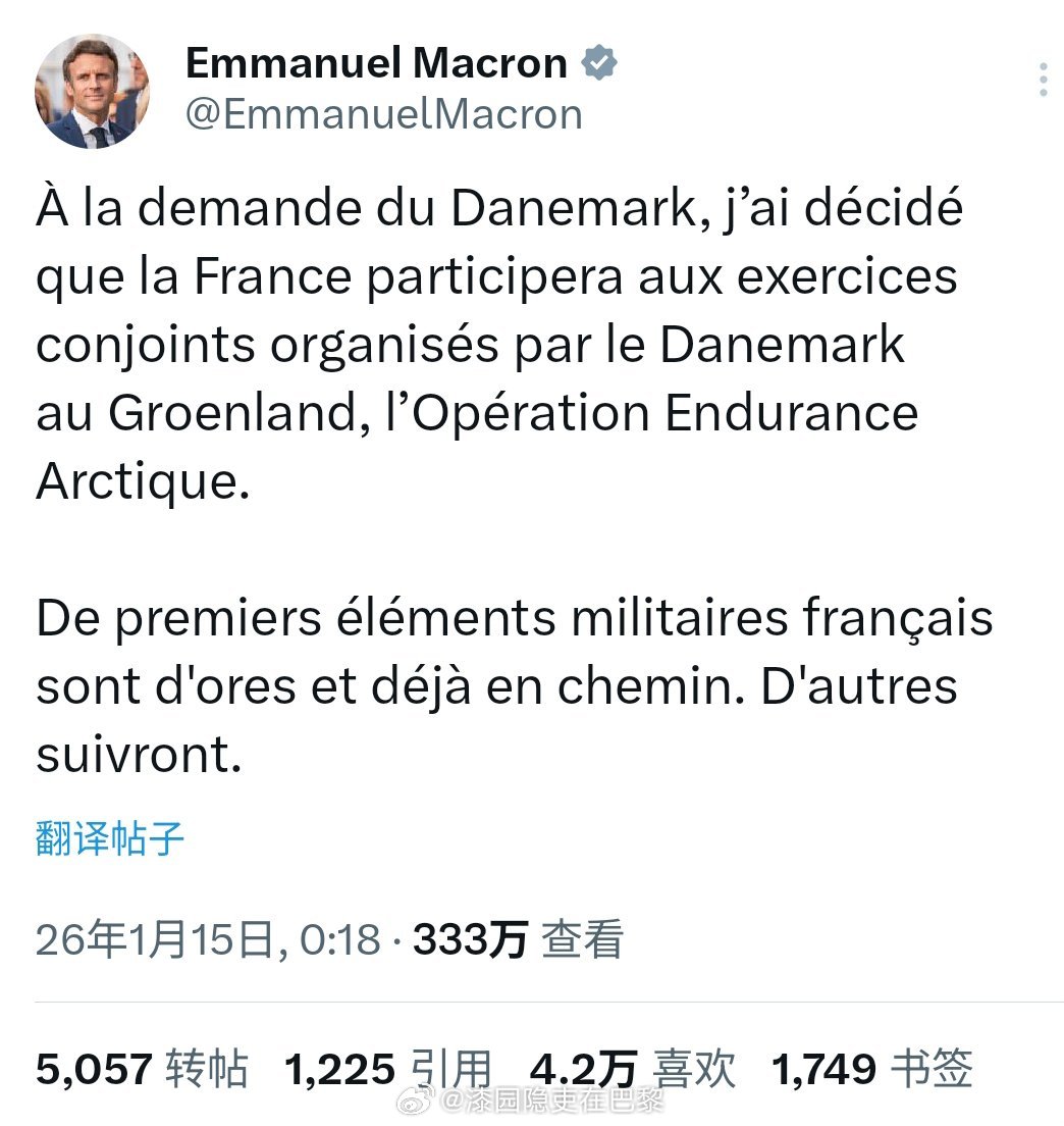 海外新鲜事 法国总统马克龙宣布:应丹麦的请求,我已决定法国将参加由丹麦在格陵兰举行的联合军事演习——“北极耐力行动”(Opération Endurance Arctique)。首批法国军事人员已在途中,后续部队也将陆续抵达。法国将派兵到格陵兰法兰西的故事法国将在格陵兰岛开设领事馆