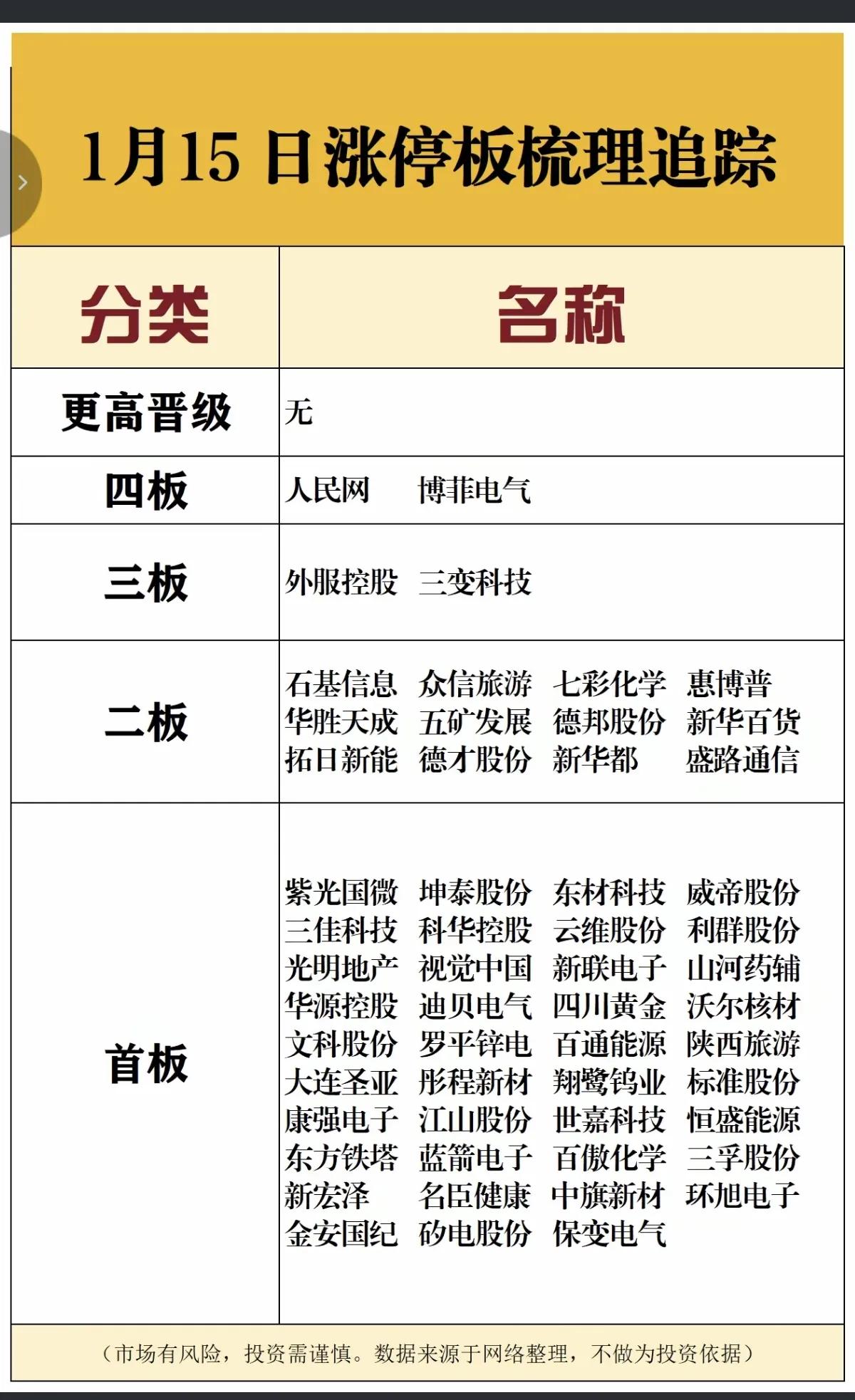 1月15日,周四A股涨停板梳理一览表!!! 今日,大A收小阳线,市场成交量2.9万亿,博菲电气今日成功晋级4连板,为今天市场最高板,后市值得期待;外服控股、三变科技今日成功晋级三板;明日,A股能否企稳回调,让我们拭目以待吧!!!
