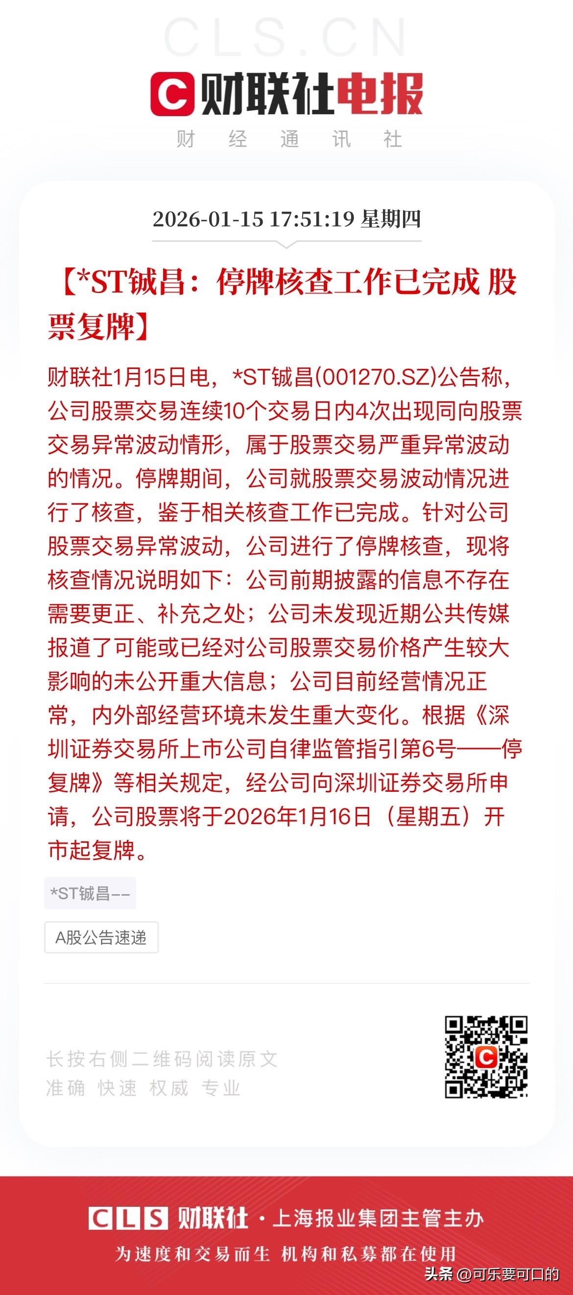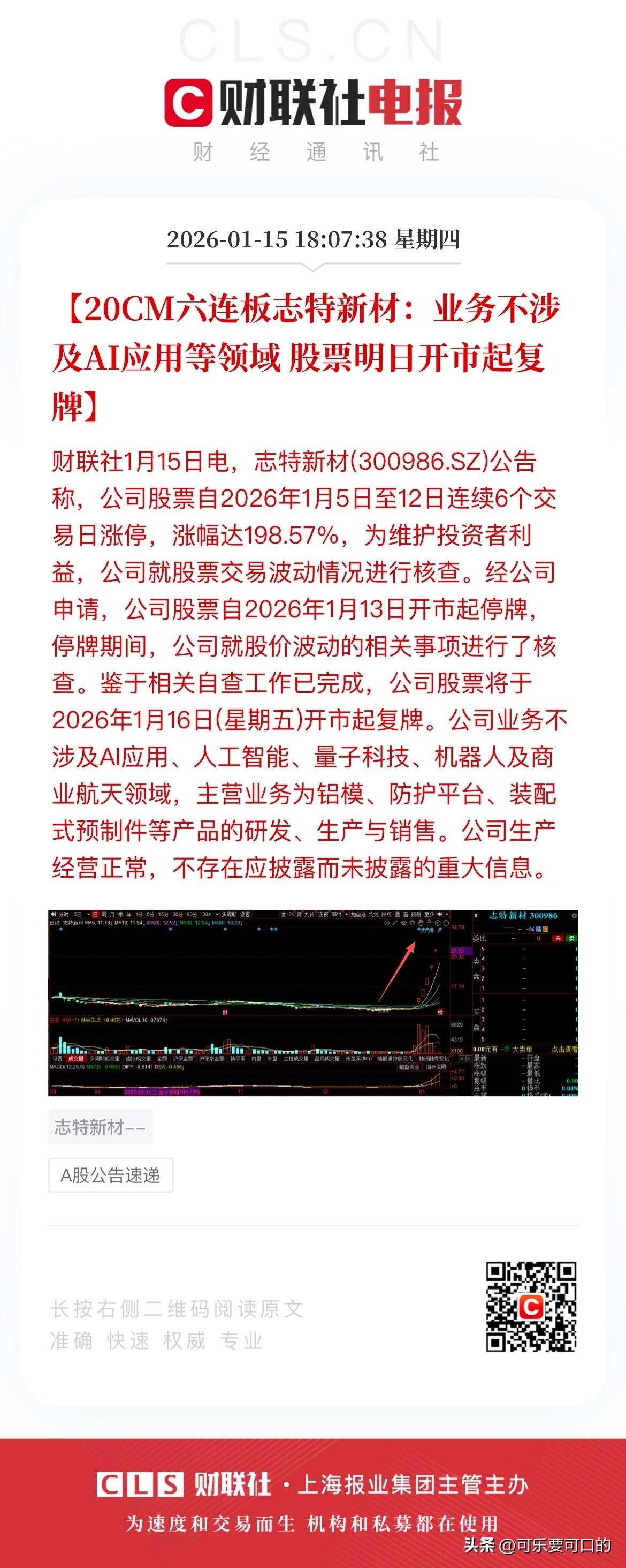 志特新材和*ST铖昌停牌核查完毕,明日复牌,明天是否会一字跌停? 志特新材是2026年第一只翻倍股,停牌前6个交易日全部20cm涨停,创业板的票这么涨还真的是非常少见!它的主业是做铝模的,但是年初市场却突然说它有AI概念,并因此被市场爆炒。 如今核查结束后公司说并不涉及AI应用和人工智能等概念,那也就是说之前的炒作理由完全不存在了,那么明天大概率是要一字板跌停了! 至于*ST铖昌则是商业航天的牛股之一,最近11个交易日10个涨停板。它与志特新材完全瞎炒不同的是它是真的做相控阵T/R芯片的,而且有极高的行业壁垒,因此公司在核查公告里也只是说未发现近期公共传媒报道了可能或已经对公司股票交易价格产生较大 影响的未公开重大信息! 但是在它停牌的这3个交易日里商业航天板块发生了翻天覆地的变化,板块内绝大多数个股都进行了回调,而且调整幅度都很大,因此明天它也极可能会补跌! 不过明天究竟怎么走还要看资金的选择,就让咱们拭目以待吧!