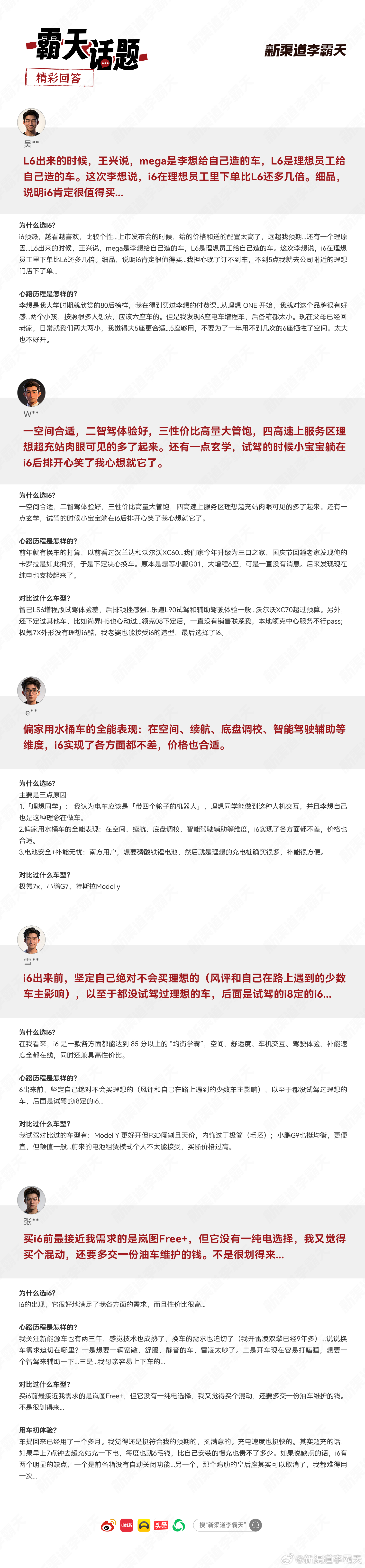 首批 i6 车主聊聊为什么选 ta?我们在i6社群开展了一期活动,邀请大家分享选购i6的原因与心路历程。精选了 5份精彩回答(图 2),分享给大家~另外,欢迎 i6车主或准车主,扫码图3加入社群!霸天资讯理想汽车理想i6
