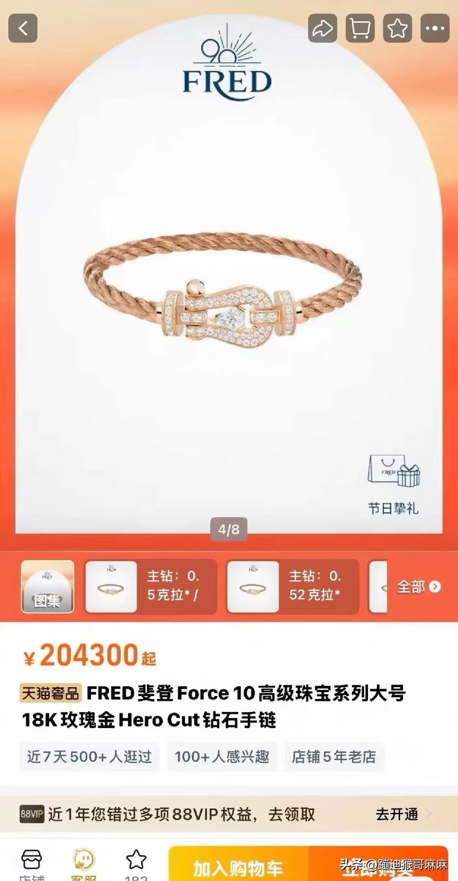 心心念念的莎莎终于出现啦!另外这届网友真是个个都有火眼金睛,连莎莎的新手链都扒出来了![捂脸] 今天有人发了和莎莎在体总的合影和签名照,我们这种神经大条的,一看照片,就觉得莎莎瘦了点,但是依旧白白嫩嫩的,身材很匀称! 有火眼金睛的人却发现莎莎换了新的手链,甚至啥牌子的都找出来了,真是福尔摩斯一样。 原来是FRED斐登Force 10高级珠宝系列大号18K玫瑰金Hero Cut钻石手链! 这款斐登Force 10大号18K玫瑰金钻石手链,甭管是20w的,还是9w,总归是爱莎莎的人送的,知道莎莎很幸福就好了! 不得不说,这款手链的设计理念和精神内核和莎莎挺像的!突破极限,无畏前行! - 灵感源自航海文化:系列名称“Force 10”取自蒲福风级最高等级,致敬品牌创始人Fred Samuel对海洋与帆船运动的热爱,其长子Henri Samuel曾以航海缆绳为灵感设计出首款Force 10手链。 - 精神内核:象征突破极限的勇气、无畏前行的态度,也代表自由不羁的生命姿态。