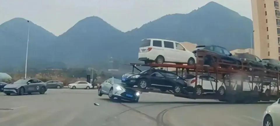 这大概就是司机之前的默契吧!一辆白色轿车被钩在轿运车尾,横着拖行数米,关键时刻一群司机做了同一件事。 昨天下午,贵阳花溪区的街道上发生了惊险的一幕。一辆正在转弯的大型轿运车,车尾不知不觉中“钩住”了一辆正常行驶的白色轿车,像挂住了一个玩具一样,拖着就走。 被钩住的小轿车司机当时就懵了,前一秒还在正常开车,下一秒突然感觉车被一股巨大力量拽着走,方向失控,车子横着被拖了好几米。 轿车侧面被轿运车的尾部结构勾住,整个车横着被拖行,轮胎与地面摩擦发出刺耳的声音。轿车司机估计猛踩刹车也没用,因为力量完全不在一个级别上。 就在这个危急时刻,路边和后面的司机们反应过来了。不是一两个人,而是好几个司机同时按响了喇叭,鸣笛声在街道上炸开。 一阵接一阵的喇叭声终于引起了轿运车司机的注意。大车缓缓停了下来,这时轿车已经被拖行了数米远。 停下后,轿车司机赶紧下车查看情况。万幸的是,这位司机没有受伤,只是车被拖行了一段,受了点惊吓。 那些鸣笛的司机们,这才是最让人暖心的。他们没有选择“事不关己高高挂起”,而是几乎同时按响了喇叭,用最直接的方式提醒前方司机。这种默契不是提前商量好的,而是在危急时刻,一群陌生人本能地做出了相同的选择——帮忙。 这也让我想到了平时开车遇到的一些情况。有时候看到前面车有问题,比如后备箱没关好、轮胎看起来不对劲,按个喇叭提醒一下,对方明白了挥挥手,这种感觉真的很好。 如果是你遇到这样的情况,会鸣笛提醒吗?