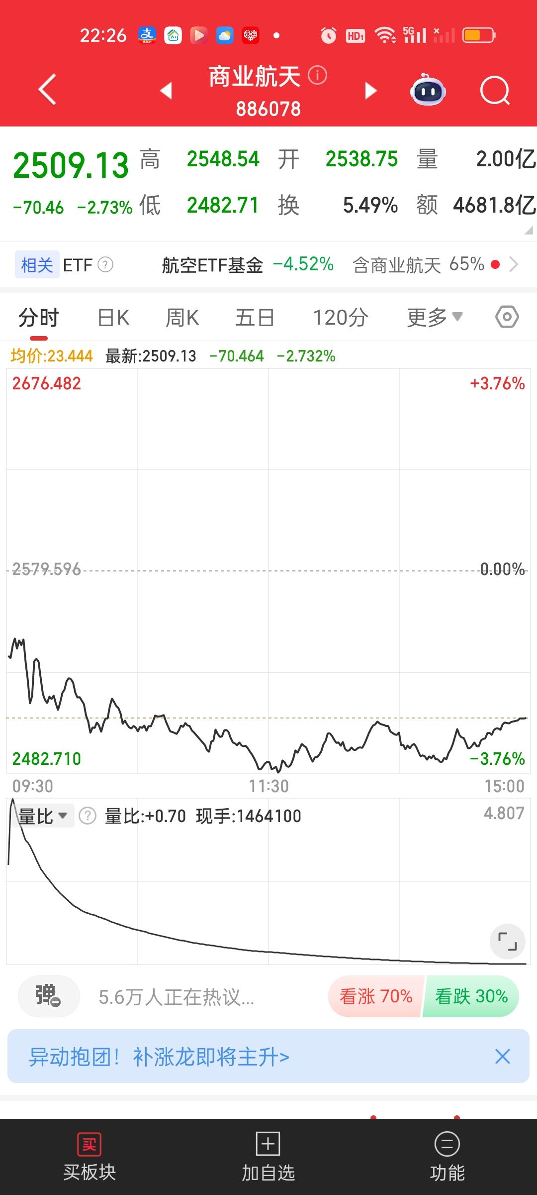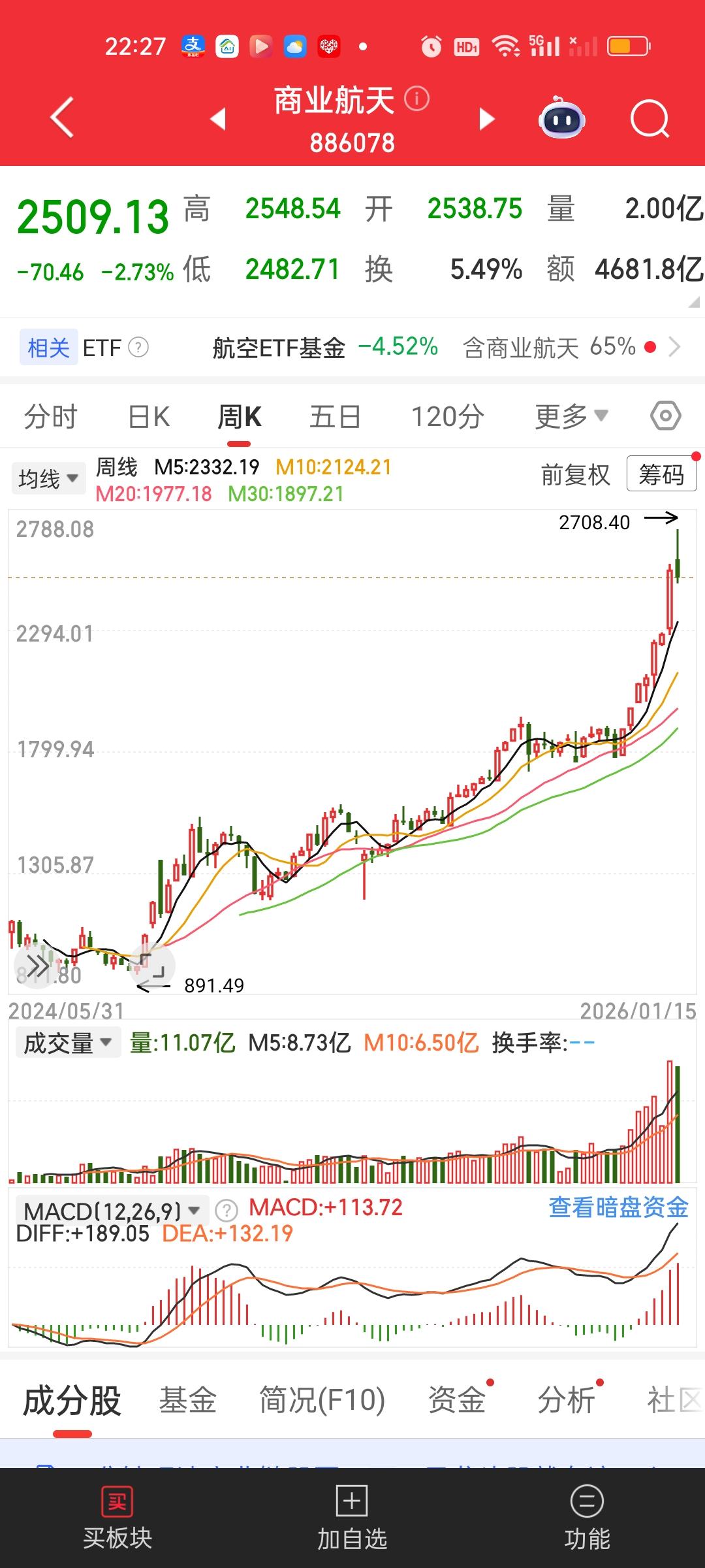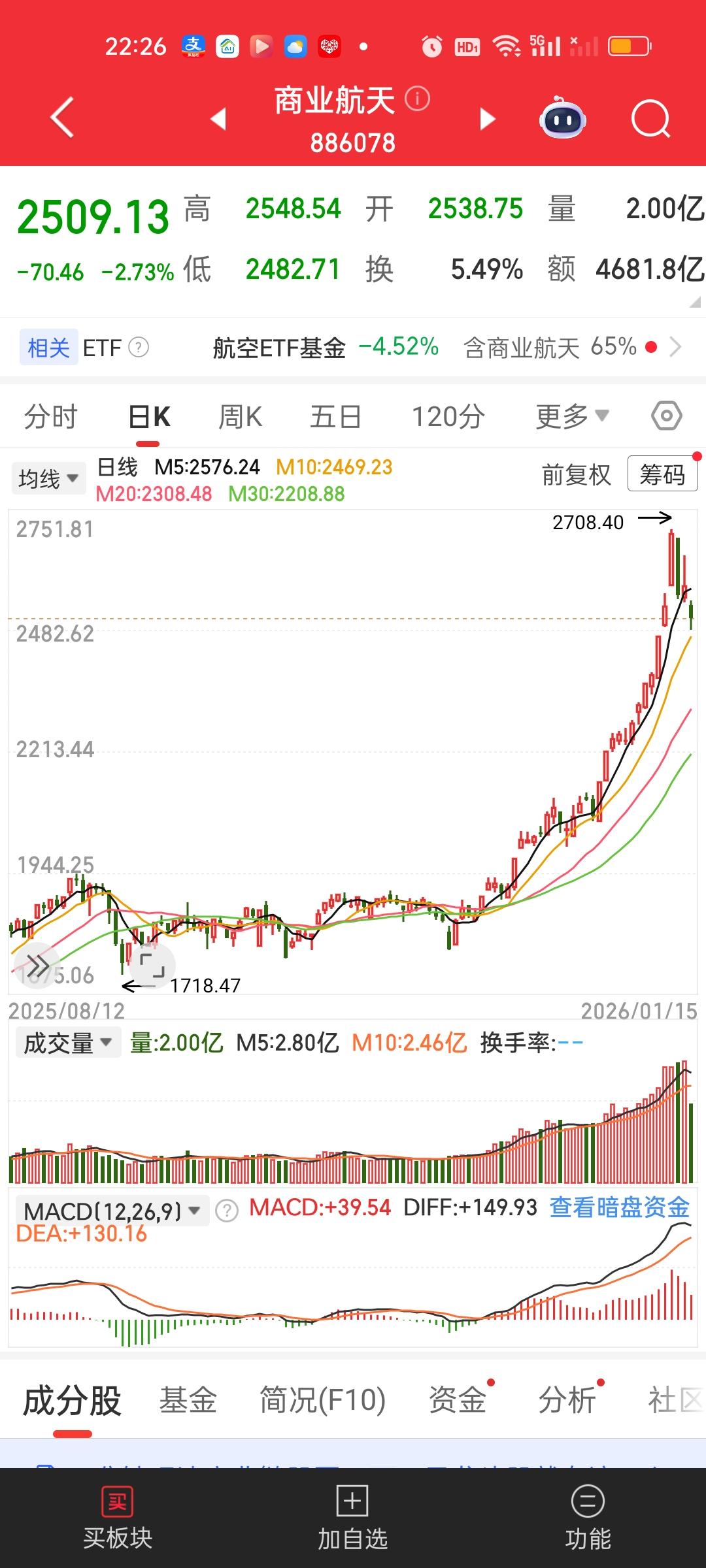 你信不信商业航天是2026年的主线?如果信那就继续格局,如果不信,前面已经涨得足够多了,挣了钱的就可以走了! 今天收在了2509.13,从高点2708.40下来,已经跌了2509.13/2708.40=0.9264,跌了7.36%。我们这里要盯紧10日线,10日线是2469.23,2469.23/2509.13=0.9840,大概还有1.60%的跌幅。允许盘中破10日线,但收盘要收在10日线上方。