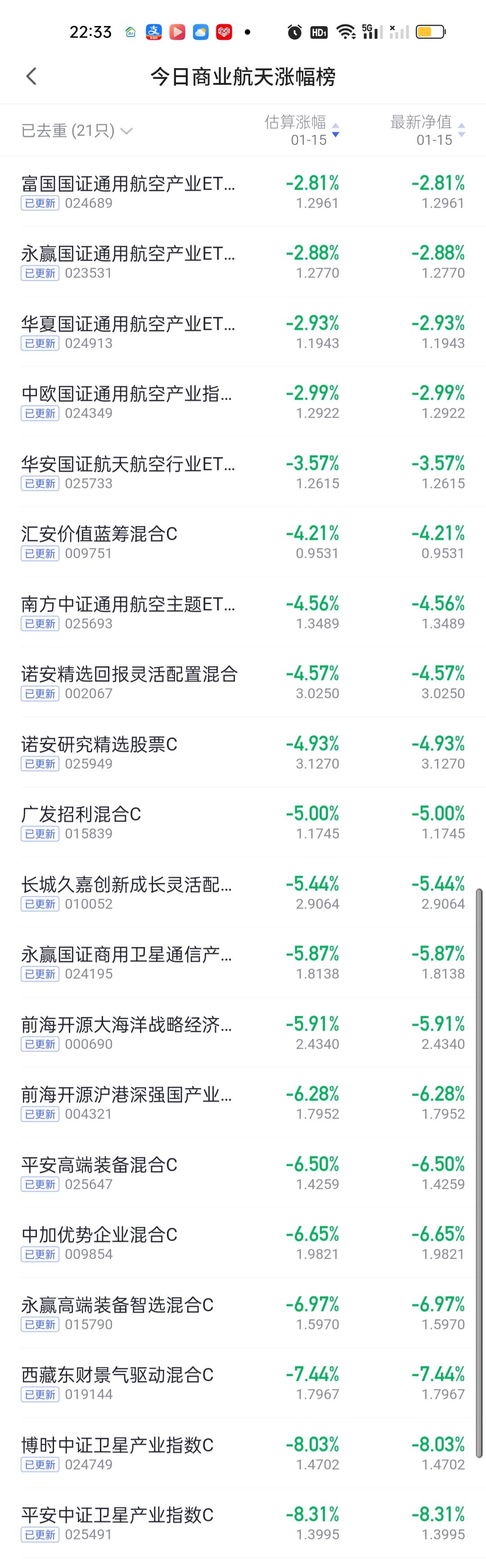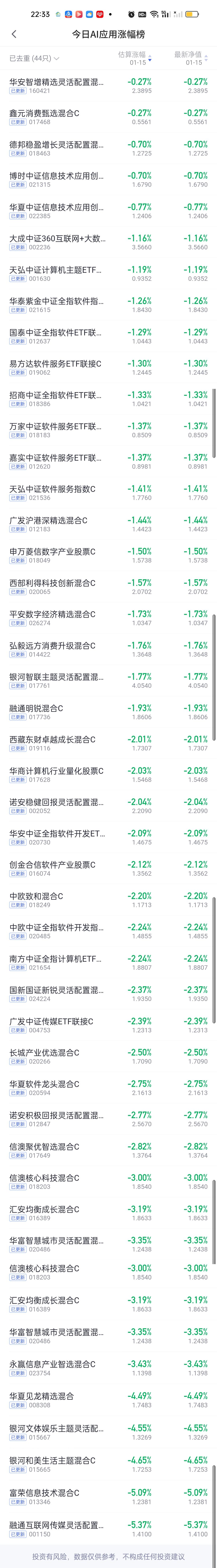 今日基金净值榜已全部更新完毕。涨幅在5%以上的基金有6只,汇安趋势动力股票5.65%排名第一,富荣福鑫5.36%排名第二,信澳至诚精选5.22%排名第三,汇添富竞争优势5.17%排名第四,东方人工智能主题和国联安匠心科技1个月滚动5.14%并列第五,中航新起航4.95%排名第六。 跌幅方面,跌幅在7%以上的基金有5只。嘉实中证高端装备细分8.98%排名第一,平安中证卫星8.31%排名第二,博时中证卫星8.03%排名第三,前海联合泳涛7.66%排名第四,西藏东财景气驱动7.44%排名第五,永赢高端装备6.97%排名第六,东方阿尔法瑞丰6.93%排名第七。 商业航天,AI应用,半导体,CPO,机器人,创新药涨幅榜一并奉上!